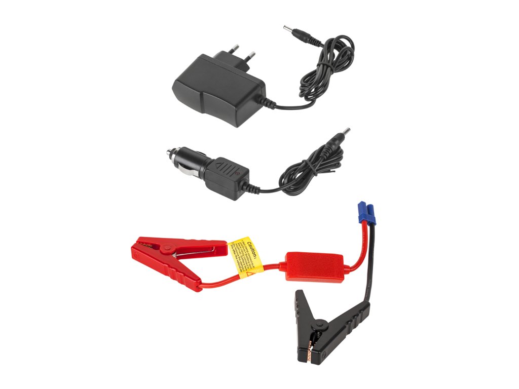 W zestawie: Kable rozruchowe, ładowarki sieciowa i samochodowa