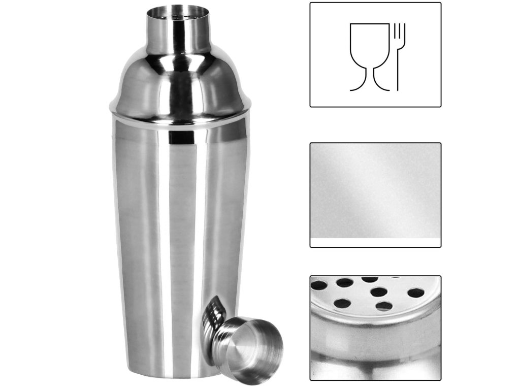1 x shaker (trodijelni) - visina: 21 cm / promjer usnika: 8,3 cm / promjer baze čaše: 6,5 cm / promjer cjedila: 4 cm