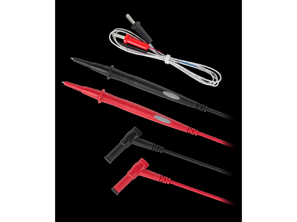 W zestawie: bateria, przewody pomiarowe, sonda pomiaru temperatury, etui
