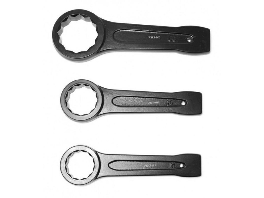 - Ojačani jednostrani udarni ključ 46 mm služi za zatezanje ili otpuštanje navojnih spojeva u raznim sektorima industrije. Ojačana konstrukcija omogućava njegovo korištenje u uvjetima gdje nije moguće koristiti dugu polugu. Ključ je opremljen drškom s amortizirajućim vrhom, koji ne vibrira i uklanja mogućnost savijanja. To osigurava preciznost i udobnost pri radu s alatom.