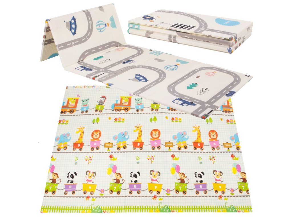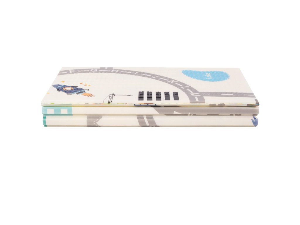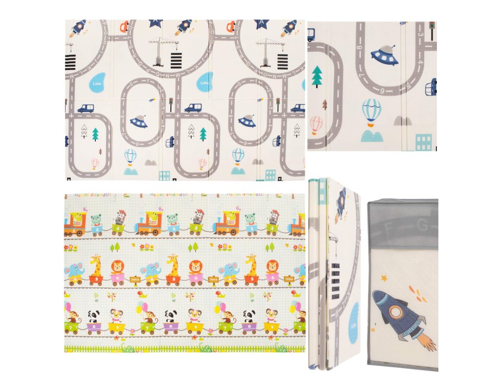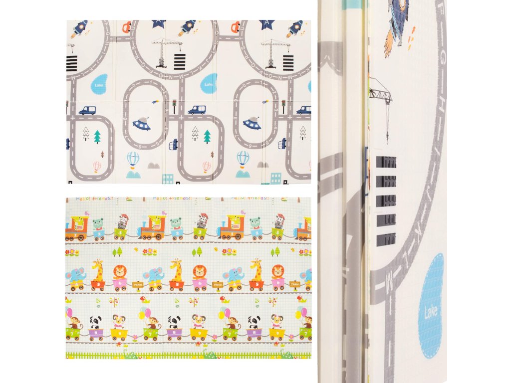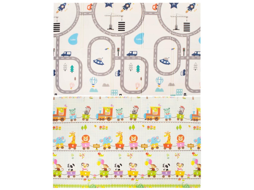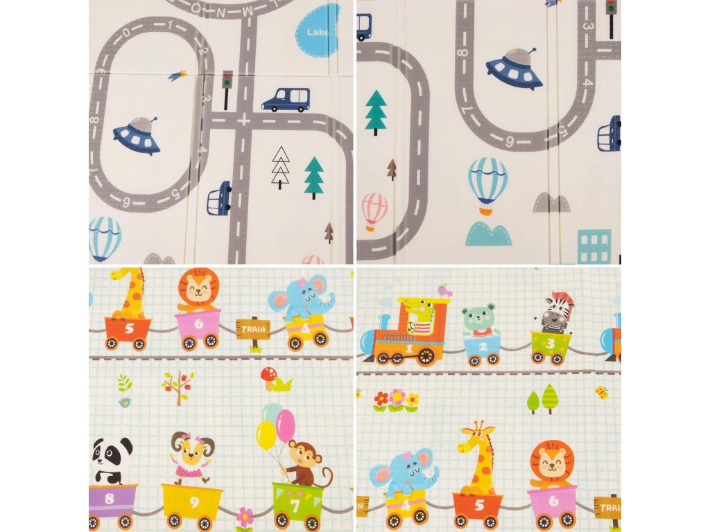 - Prostirka je dvostrana. Na jednoj strani je uzorak ulica i vozila na ecru pozadini. Na drugoj strani prostirke je uzorak šarenih vlakova sa životinjama i plavo kockasto na ecru pozadini.
