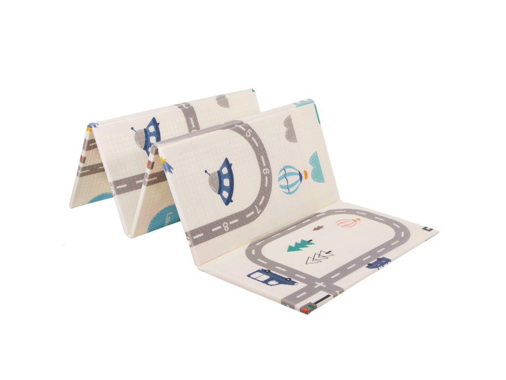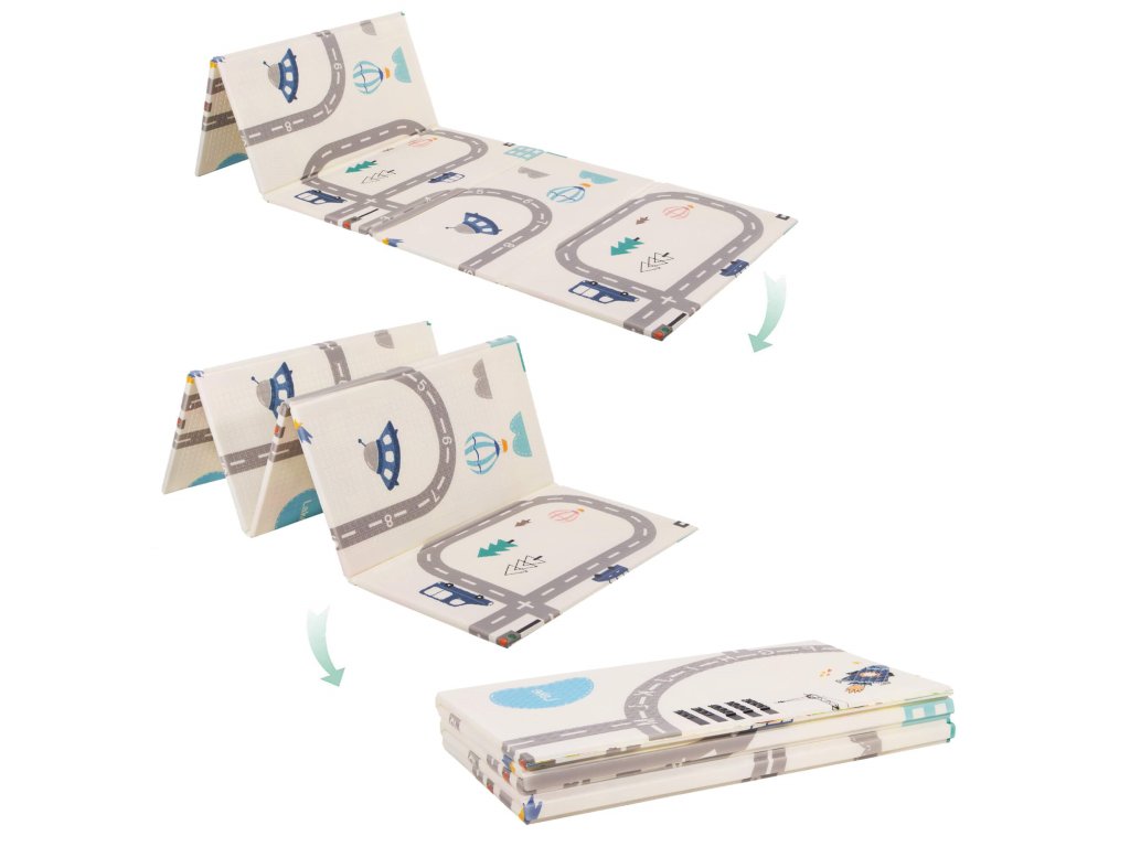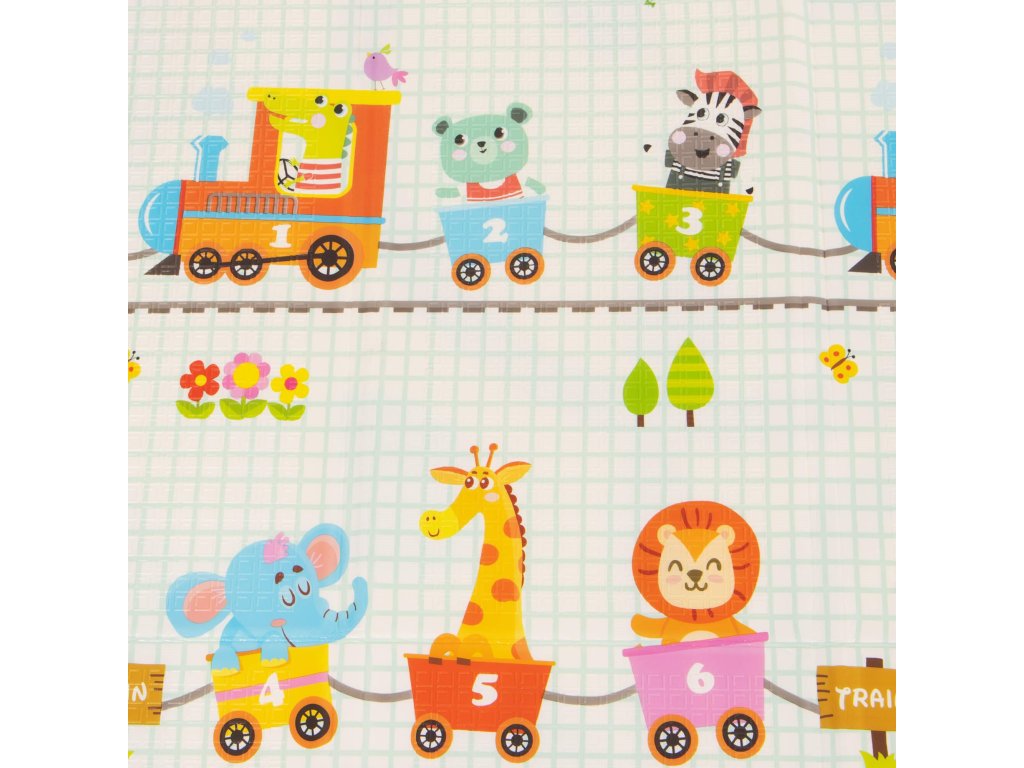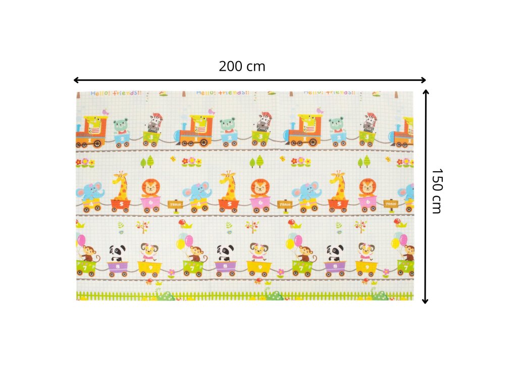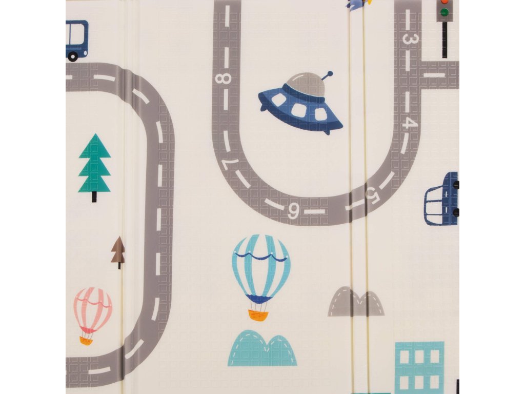 - Prostirka je dvostrana. Na jednoj strani je uzorak ulica i vozila na ecru pozadini. Na drugoj strani prostirke je uzorak šarenih vlakova sa životinjama i plavo kockasto na ecru pozadini.