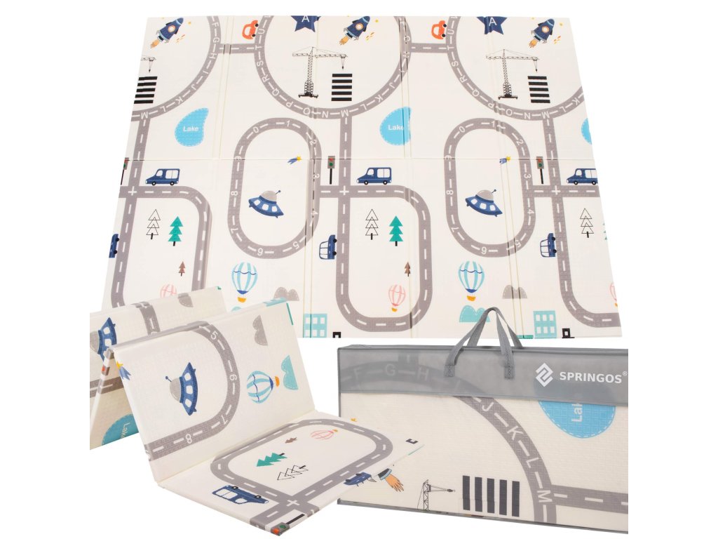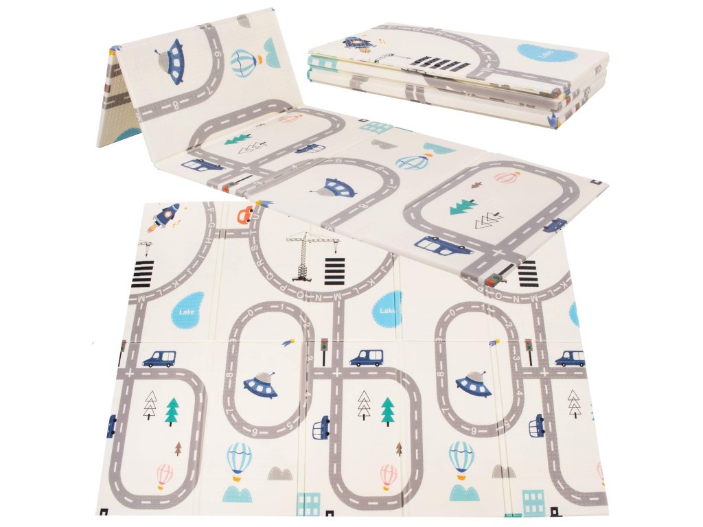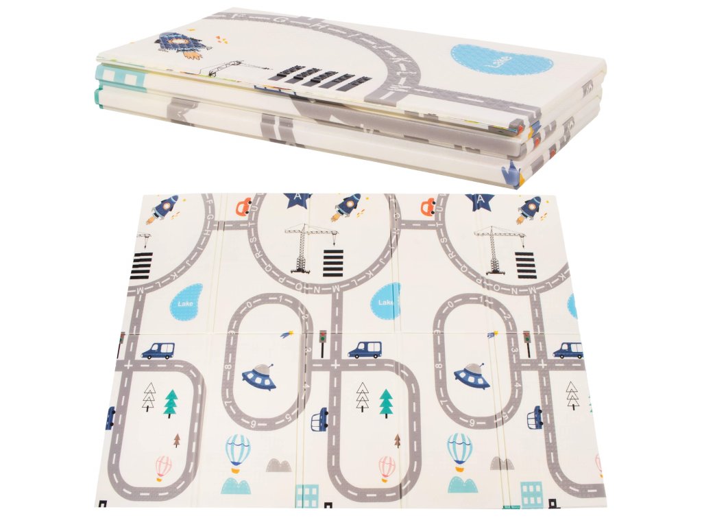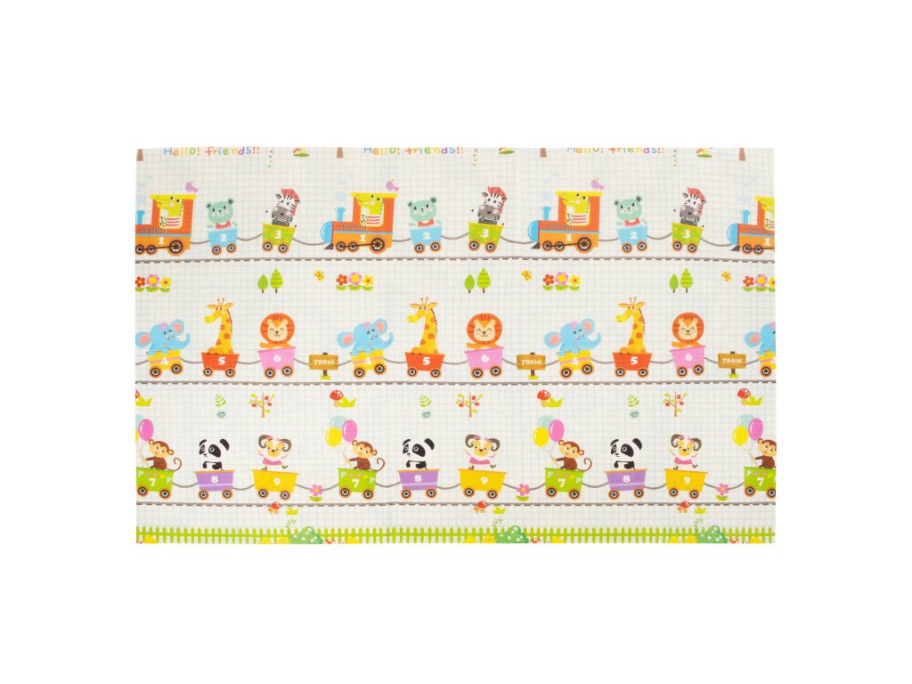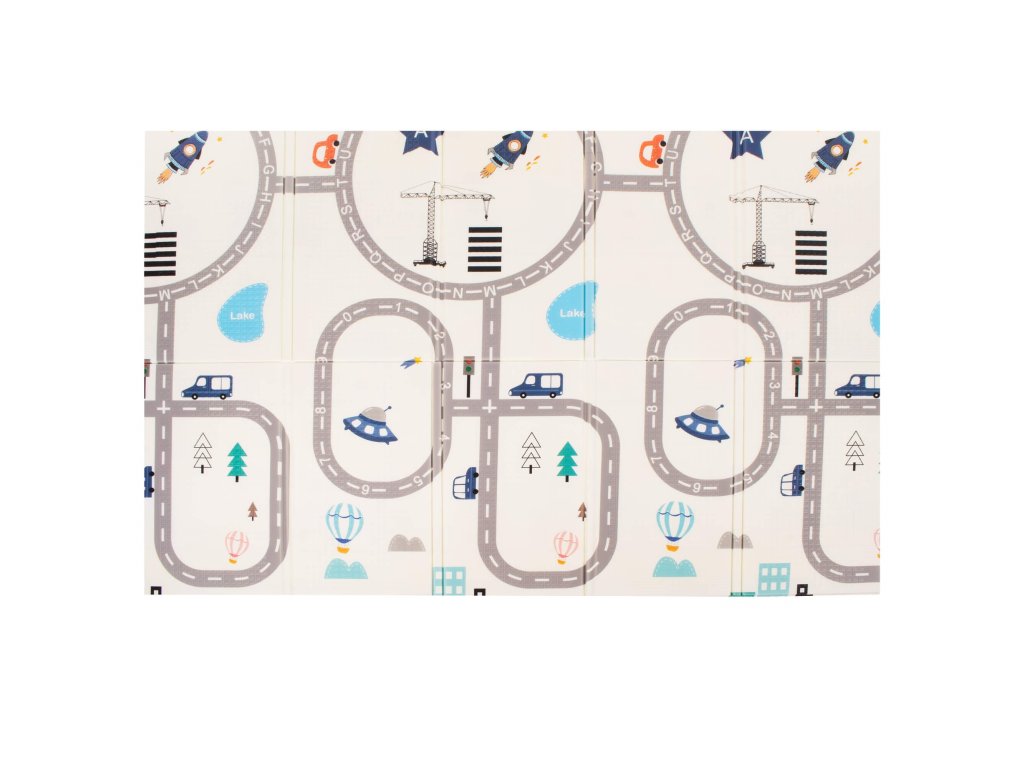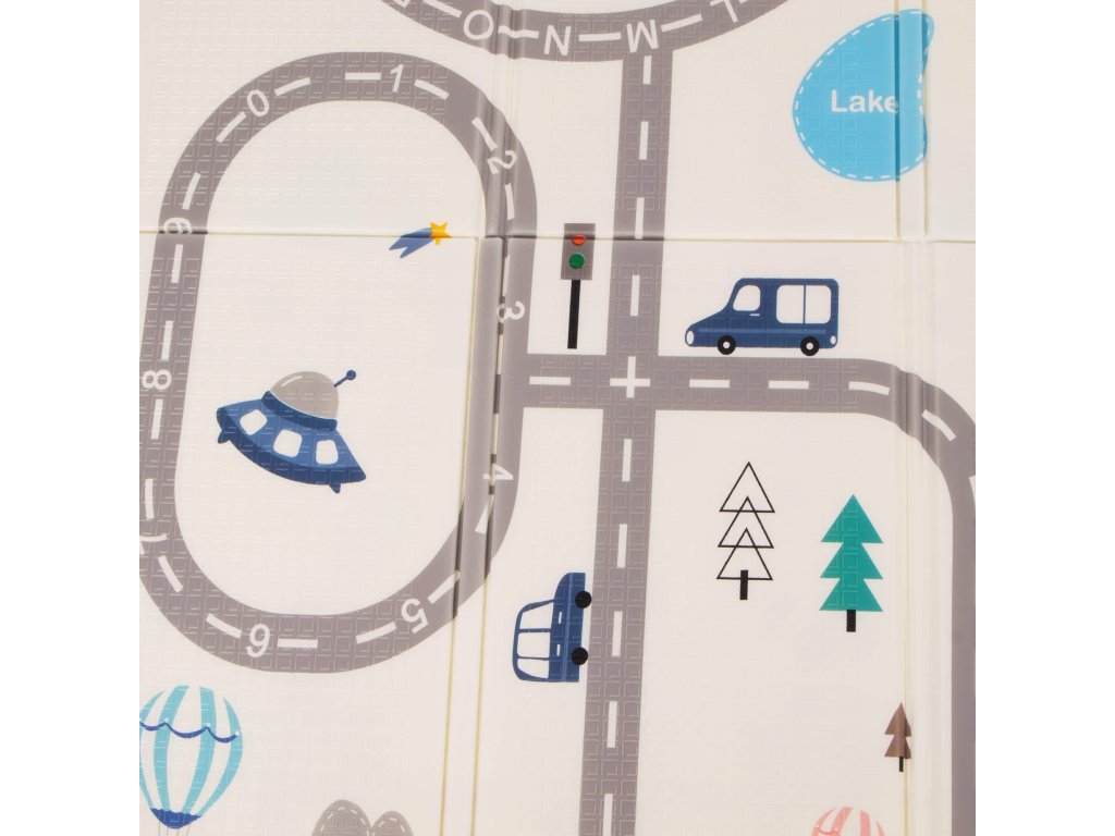 - Prostirka je dvostrana. Na jednoj strani je uzorak ulica i vozila na ecru pozadini. Na drugoj strani prostirke je uzorak šarenih vlakova sa životinjama i plavo kockasto na ecru pozadini.