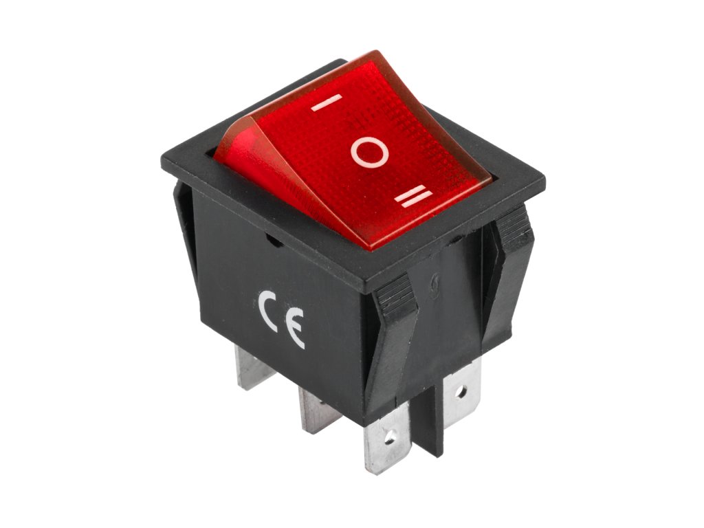 Klackasti prekidač PRK0046 ON-OFF-ON, 6-pin, 3-položaja, crveni, osvijetljeni,