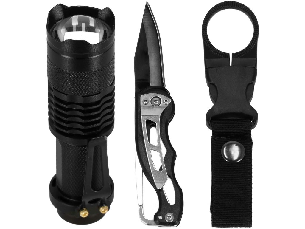 - 1x taktička svjetiljka - s podesivim snopom svjetla + čvrsta kopča / duljina: 10 cm, promjer: 5 cm