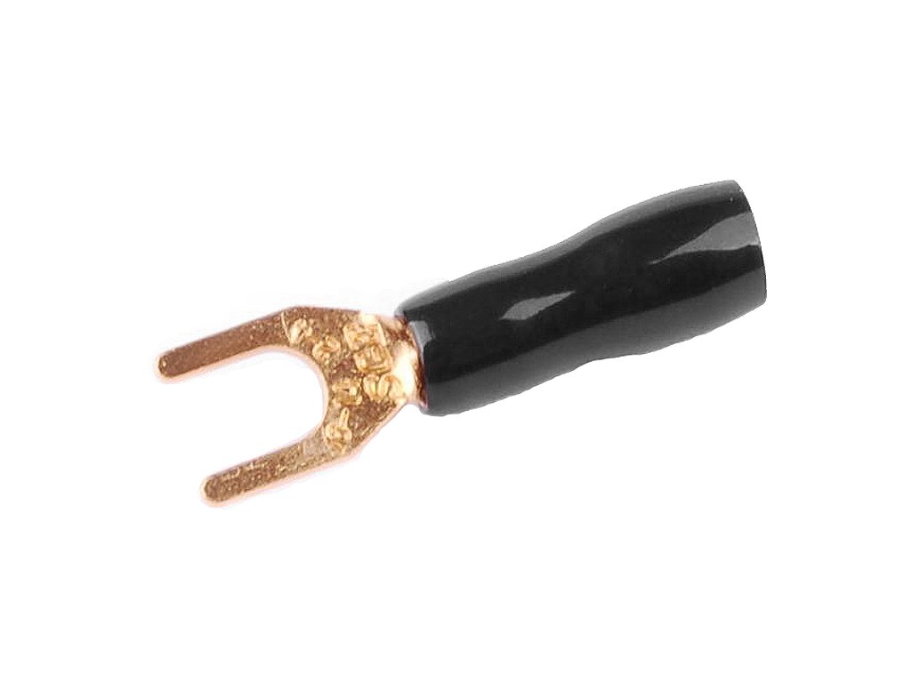 Końcówki widełkowe złocone izolowane do kabli miedzianych wielodrutowych.
