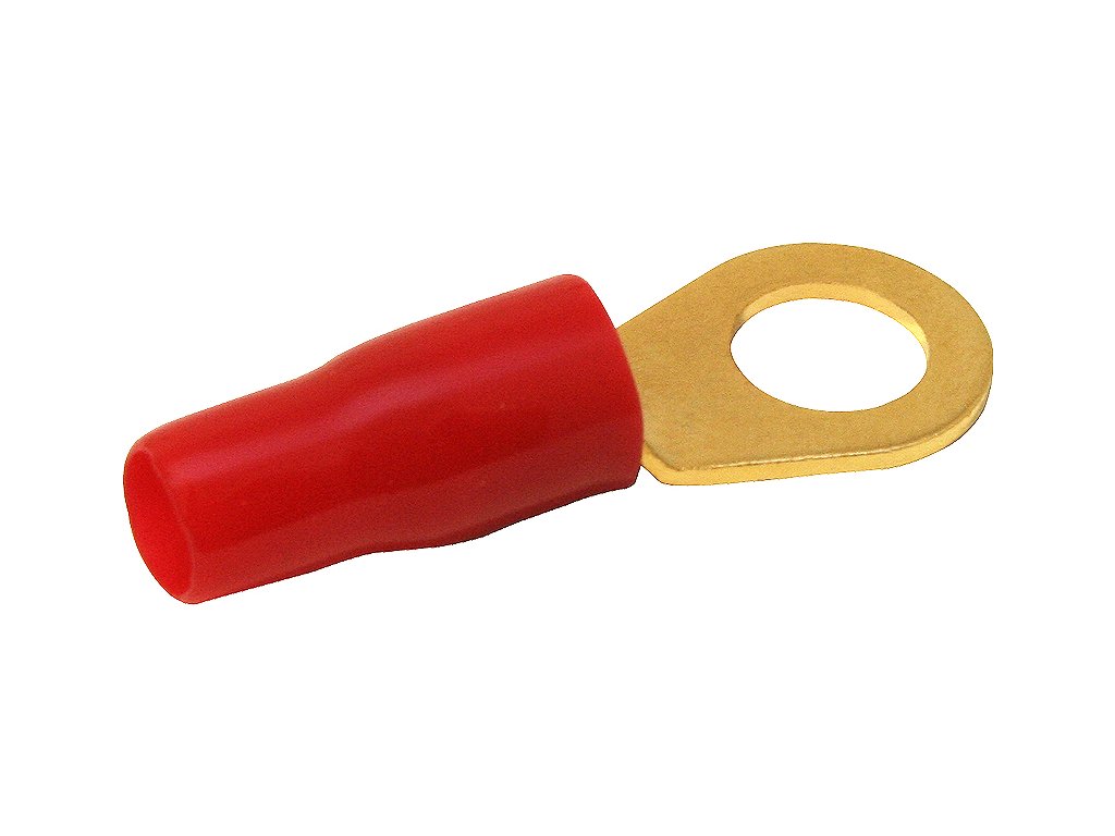 Złocone końcówki oczkowe izolowane do kabli miedzianych wielodrutowych.