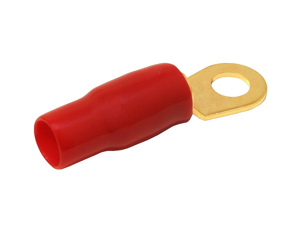 Złocone końcówki oczkowe izolowane do kabli miedzianych wielodrutowych.