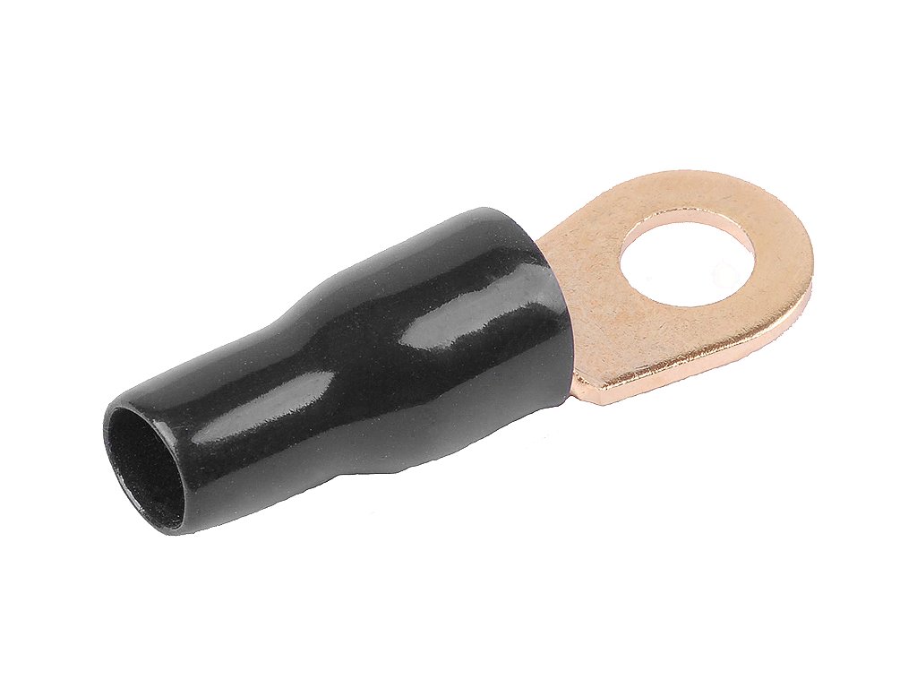 Złocone końcówki oczkowe izolowane do kabli miedzianych wielodrutowych.
