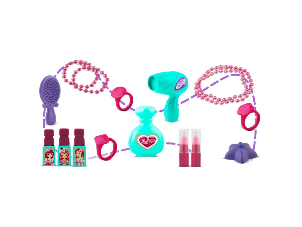 - brojni pribor u cijeni: fen, četka, prsteni 3 komada, parfem, ruž 2 komada i lak za nokte 3 komada, narukvice 2 komada, ogrlica,