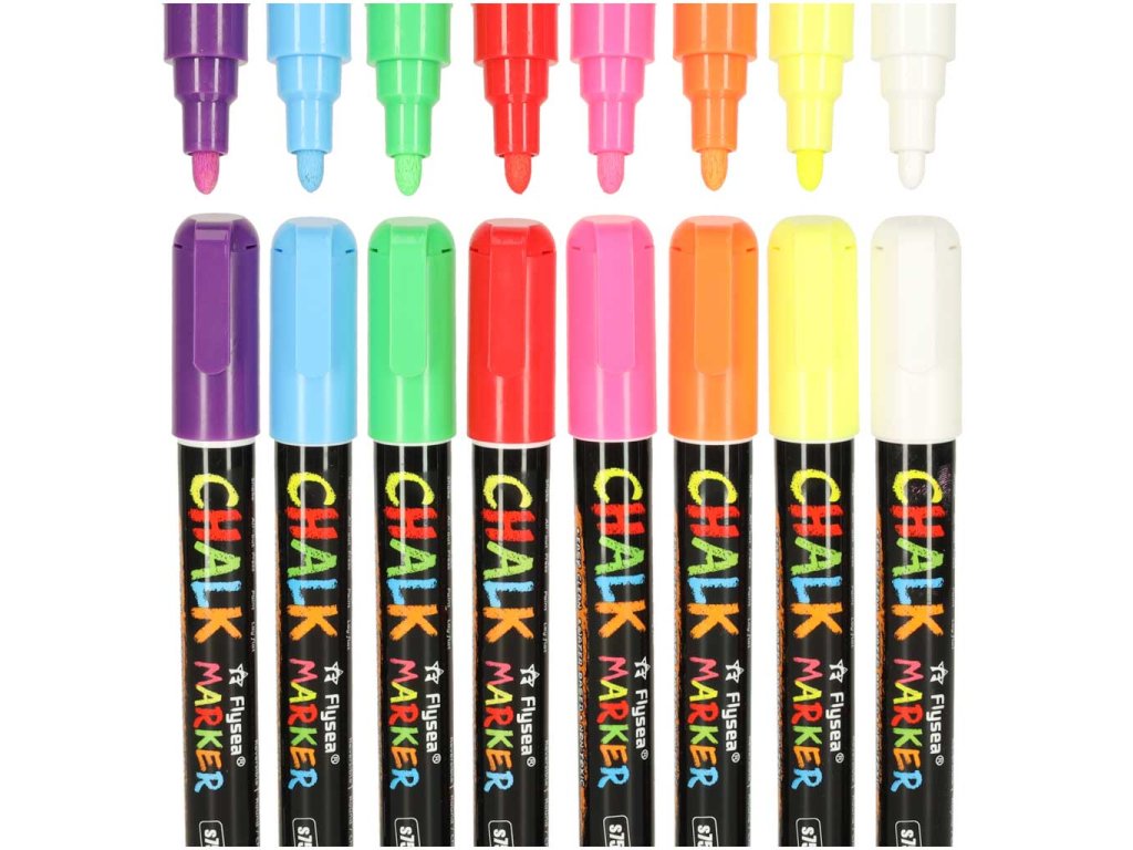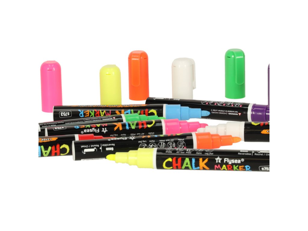 Ovaj set8 krednih flomastera je idealan izbor za stvaranje crteža, natpisa i dekoracija na raznim glatkim površinama - ploče, staklo, ogledala, čaše ili plastični predmeti. Idealan za kućnu i profesionalnu upotrebu, na primjer u kafićima, restoranima ili školama.