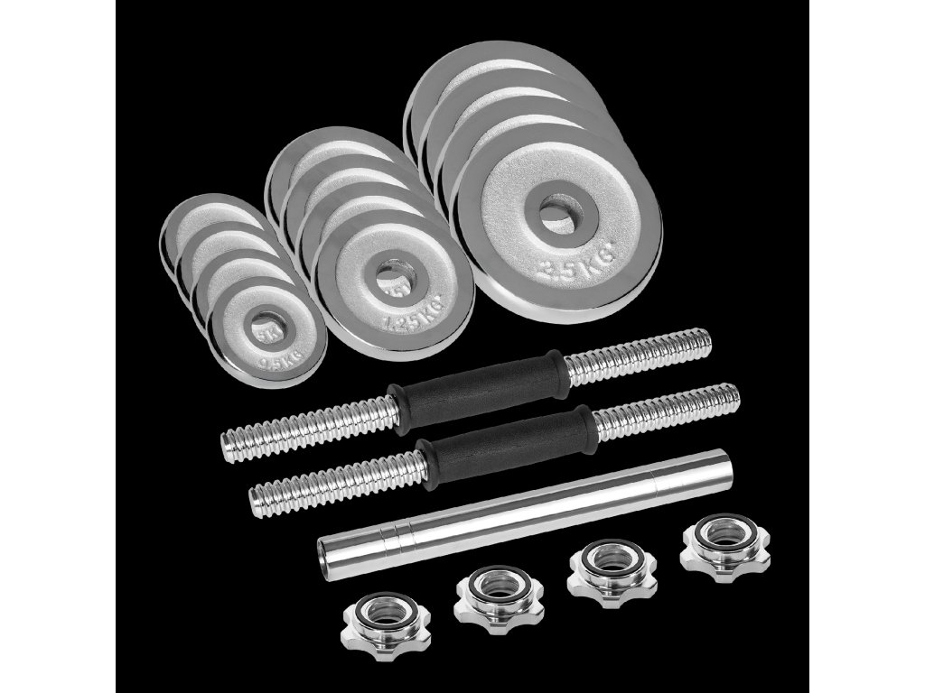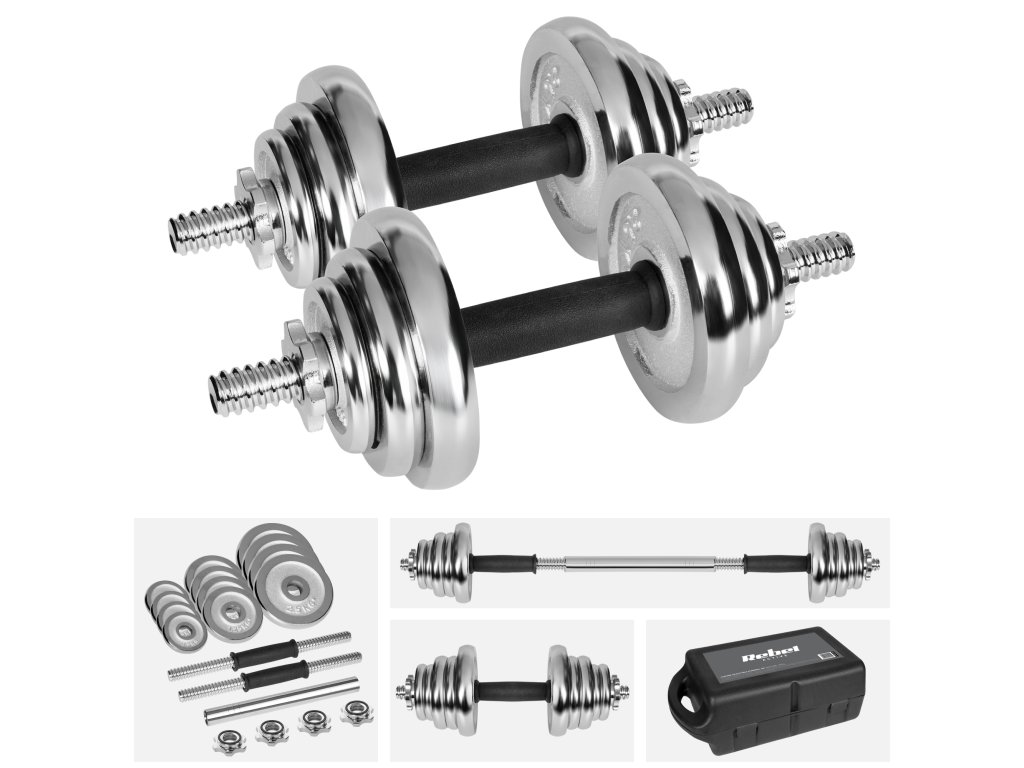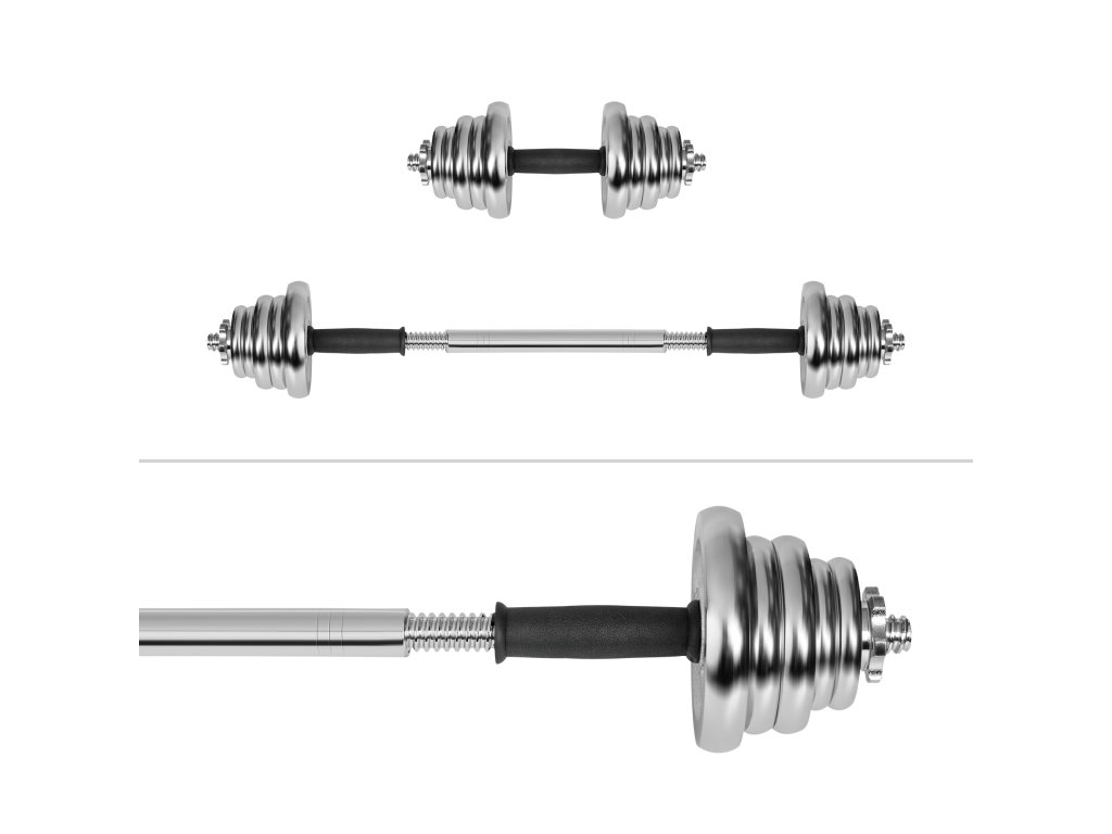 Set je izrađen od visokokvalitetnog lijevanog željeza, prekrivenog izdržljivim kromiranim slojem koji štiti od korozije, ogrebotina i mehaničkih oštećenja. Krom daje bučicama elegantan izgled i povećava njihovu trajnost čak i pri intenzivnoj upotrebi.