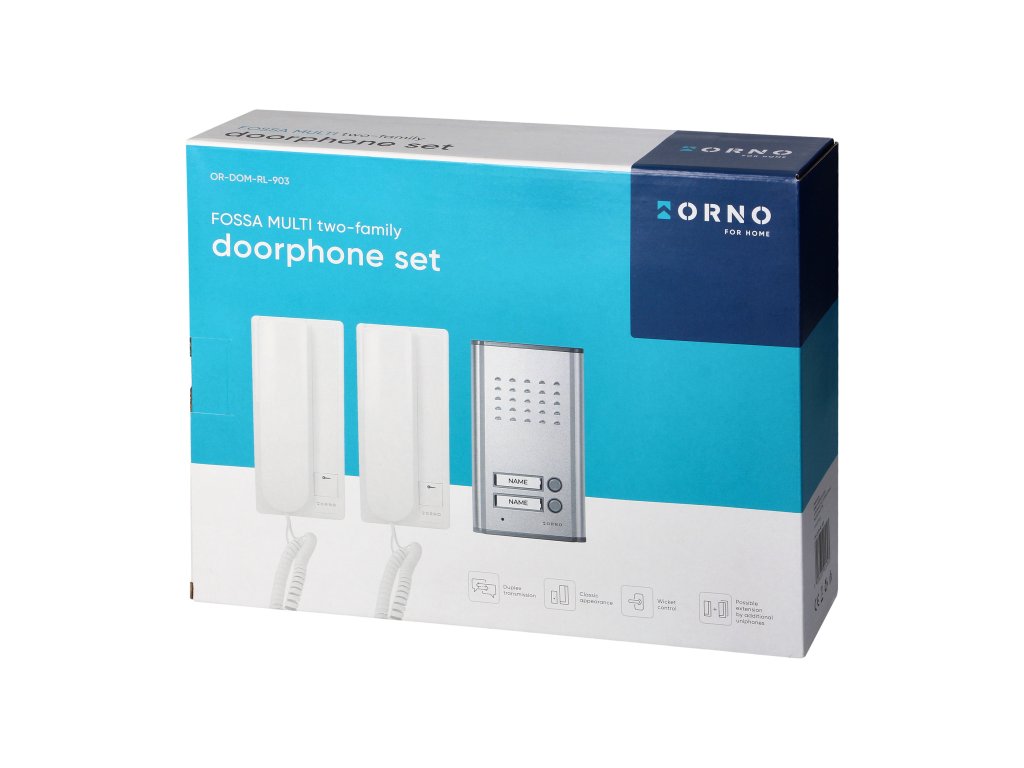 Vanjska ploča zahtijeva ugradnju u zid (korištenje zaštitnog pokrova protiv kiše OR-DOM-RL-901DN omogućuje površinsku montažu) Podsvijetljeno mjesto za ime Duplex prijenos omogućuje neometanu konverzaciju Klasičan i elegantan unutarnji uređaj opremljen slušalicom Izravna kontrola električnog impulsa bez ikakvih dodatnih transformatora Energetska učinkovitost Svaki unutarnji uređaj zaštićen je osiguračem.