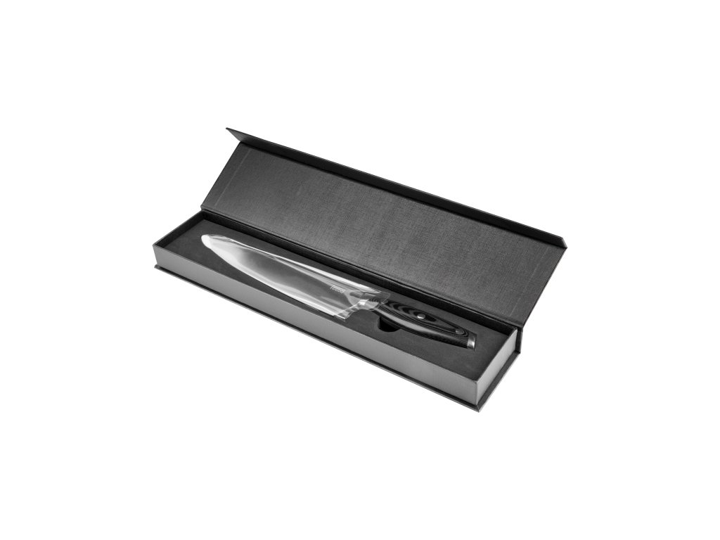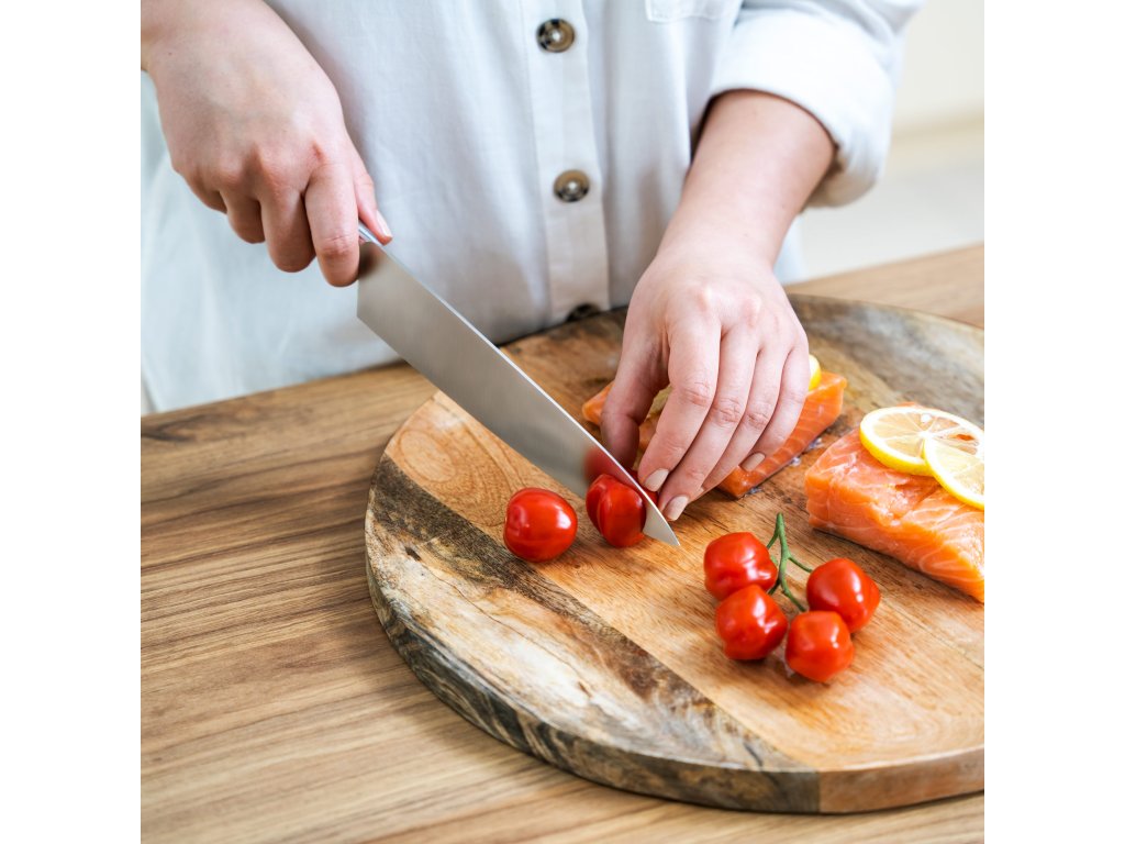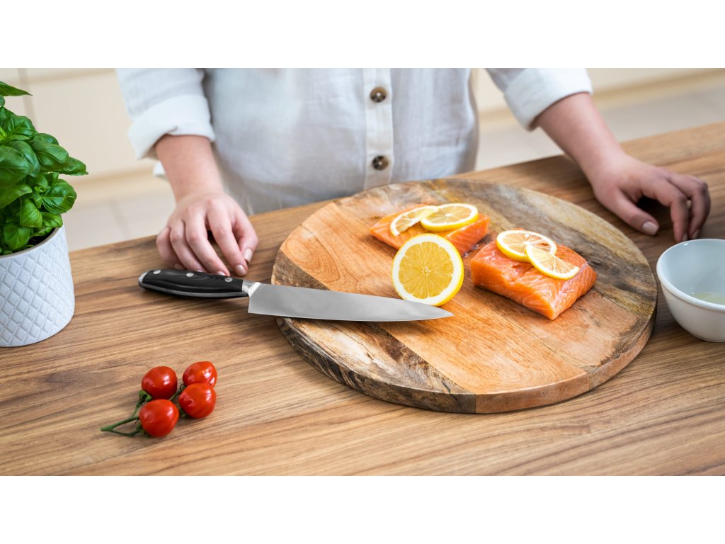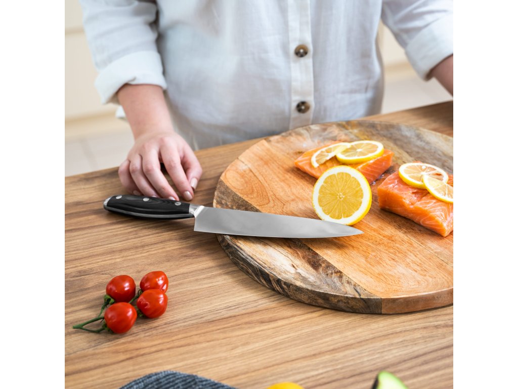 Volite li iznenaditi svoju obitelj i prijatelje novim jelima Dobar kuhinjski nož je u kuhinji apsolutno neophodan. Za ovu vrstu kuhinjskog noža karakteristična je duga, široka i savršeno oblikovana oštrica, zahvaljujući kojoj je vrlo svestran. Lako ćete njime narezati meso, ribu, ali i povrće ili začinsko bilje.