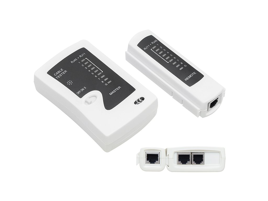 Tester kablova RJ45 i RJ11 - proizvod otkriva abnormalnosti, kao što su kratki spoj, prekinuta veza, zamijenjene žice ili zamijenjeni parovi, putem signalnog sustava koji se sastoji od 9 LED dioda. Set uključuje glavnu jedinicu, daljinsku jedinicu, futrolu i upute za uporabu.
