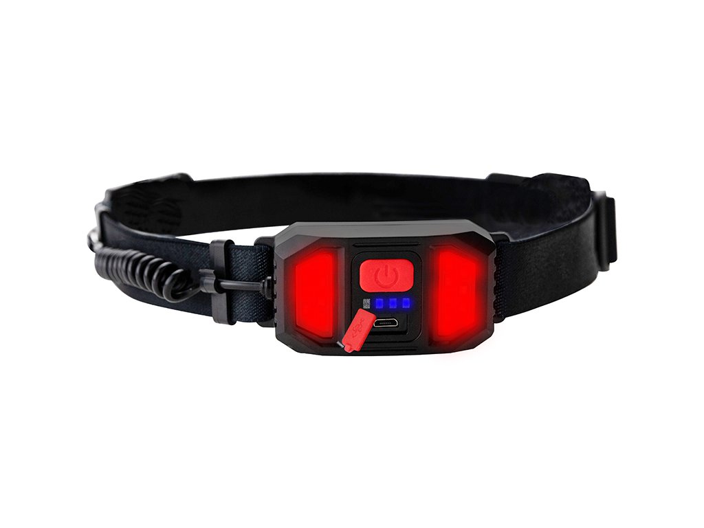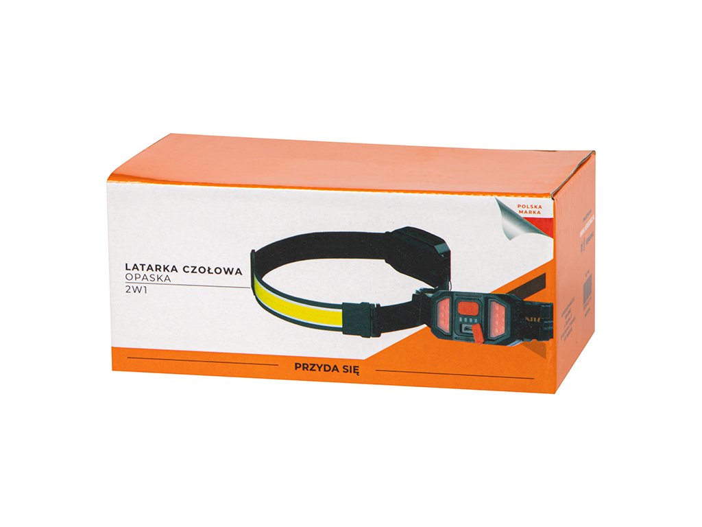 Latarka wyposażona jest w dwie lampki przednią i tylną - Przednia posiada mocną białą taśmę LED COB, która świeci na odległość 50 m. Tylna natomiast wyposażona w 15 czerwonych diod, które zapewniają bezpieczeństwo i ostrzegają innych. Dzięki regulowanej opasce elastycznej można dopasować ją do każdego rozmiaru głowy oraz zabezpieczyć przed spadaniem.