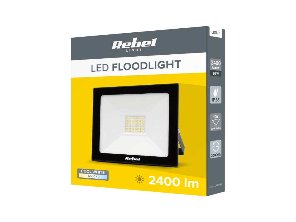 Reflektor LED Rebel o mocy 30 W jest wyposażony w 42 diody typu 2835 SMD, które emitują intensywne, zimne białe światło o temperaturze barwowej 6500 K. Dzięki strumieniowi świetlnemu wynoszącemu do 2400 lumenów oraz wysokiej efektywności świetlnej 80 lm/W, reflektor doskonale oświetla szerokie obszary z kątem świecenia 120°.