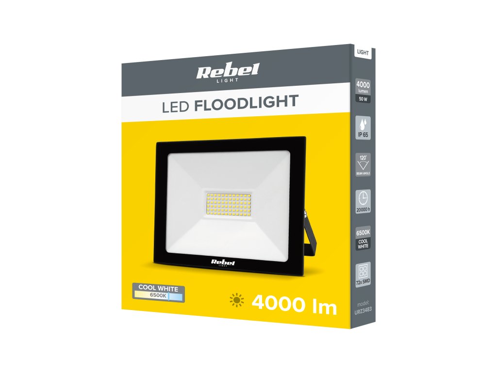 Reflektor LED Rebel wyposażony jest w 84 diody SMD 2835, oferując moc 50 W i strumień świetlny do 4000 lumenów. Dzięki wysokiej efektywności świetlnej 80 lm/W zapewnia intensywne i jasne oświetlenie.