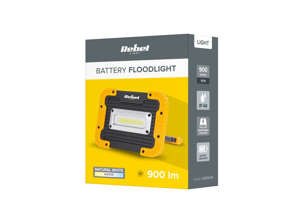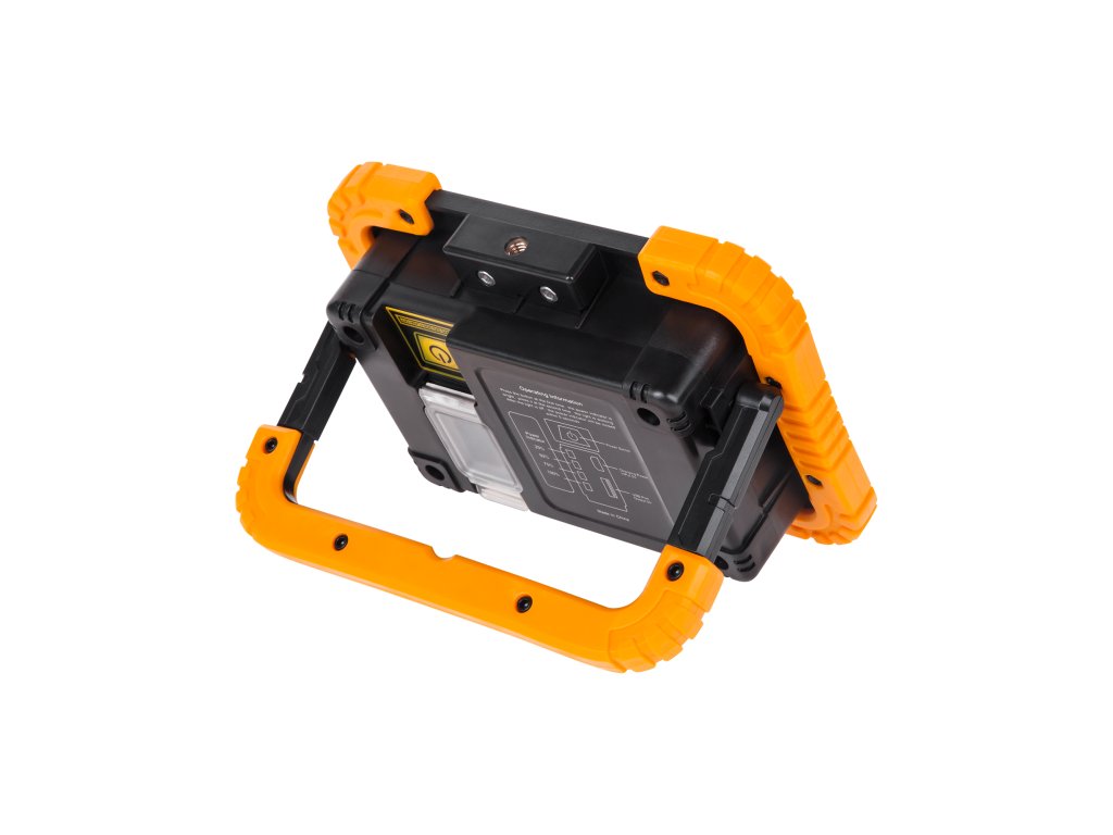 Źródło światła: 1x COB Tryby świecenia: 100%, 50%, SOS, miganie Temperatura barwowa: 4000 K Strumień świetlny: 900 lm Efektywność: 90 lm/W Kąt świecenia: 120° CRI: >70 Klasa ochronności: III Stopień ochrony: IP44 Temperatura pracy: - 20°C – 45°C Żywotność: 20 000 godz. Wskaźnik naładowania akumulatora Regulowany uchwyt Funkcja power bank Mocowanie gwintowe 1/4’’ Moc: 10 W Akumulator: 3,7 V / 4,4 Ah Funkcja power bank: 5 V / 1 A Ładowanie reflektora: 5 V / 1 A Czas ładowania: do 5 godz. Waga: 435 g Wymiary: 170x125x46 mm W zestawie: kabel micro USB, instrukcja obsługiŹródło światła: 1x COB