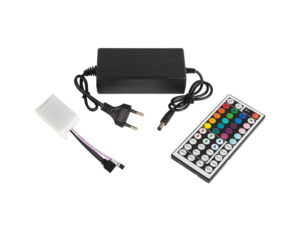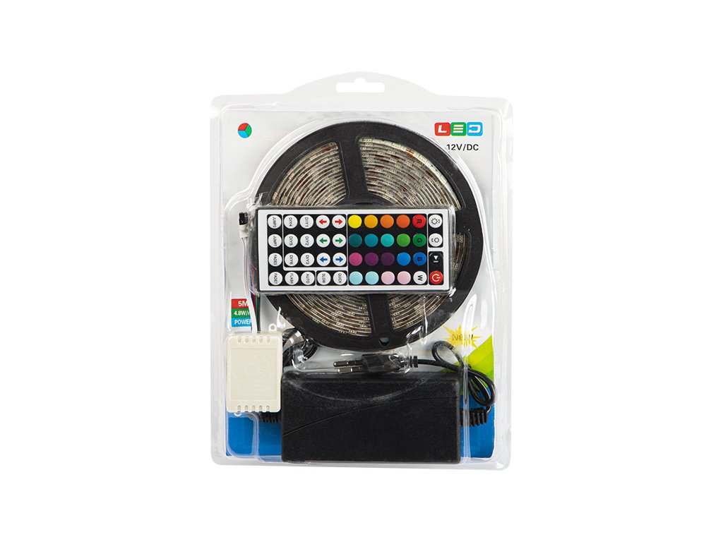 - Dužina napojnog kabela: otprilike 40 cm RGB LED traka s upravljačem i napojnim izvorom. Proizvod je izrađen na fleksibilnoj i izdržljivoj traci s PCB podlogom. Izvor svjetlosti su SMD LED diode koje isijavaju snažno svjetlo. Zahvaljujući mogućnosti dijeljenja (svakih 5 cm - 3 LED diode) traka se može koristiti na mnoge načine. Idealna je za osvjetljavanje podova, namještaja, vitrina, reklama, stepenica, akvarija itd. Može se koristiti i za stvaranje svjetlosnih akcenata u klubovima, ugostiteljskim objektima, a također kao vanjska rasvjeta kuće. Instalacija na površinu moguća je zahvaljujući obostranoj ljepljivoj traci 3M koja je korištena na donjoj strani. .