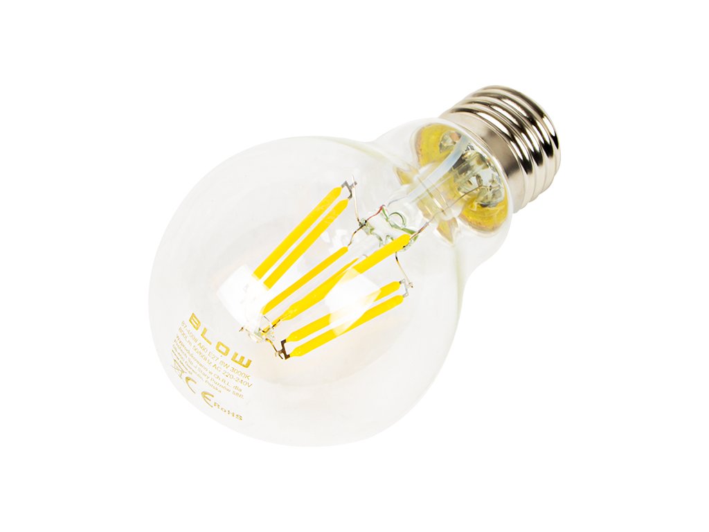 Specifikacija:Tehnologija: LEDTip navoja: E27Staklo: prozirnoSnaga: 8WLuminoznost: 800lmBoja svjetla: toplo bijelaTemperatura boje: 3000KNapon napajanja: 220-240 V AC, 50/60 HzEnergetska klasa: A+ Klasična žarulja s prozirnim staklom BLOW izrađena je pomoću modernih rješenja s korištenjem inovativne LED tehnologije, koja se odlikuje visokom učinkovitošću svjetlosnih parametara, vjernom reprodukcijom boja osvijetljenih predmeta i iznimno dugim vijekom trajanja. Idealna je kao dekoracija za klasična i moderna stropna svjetla.Dodatni parametri