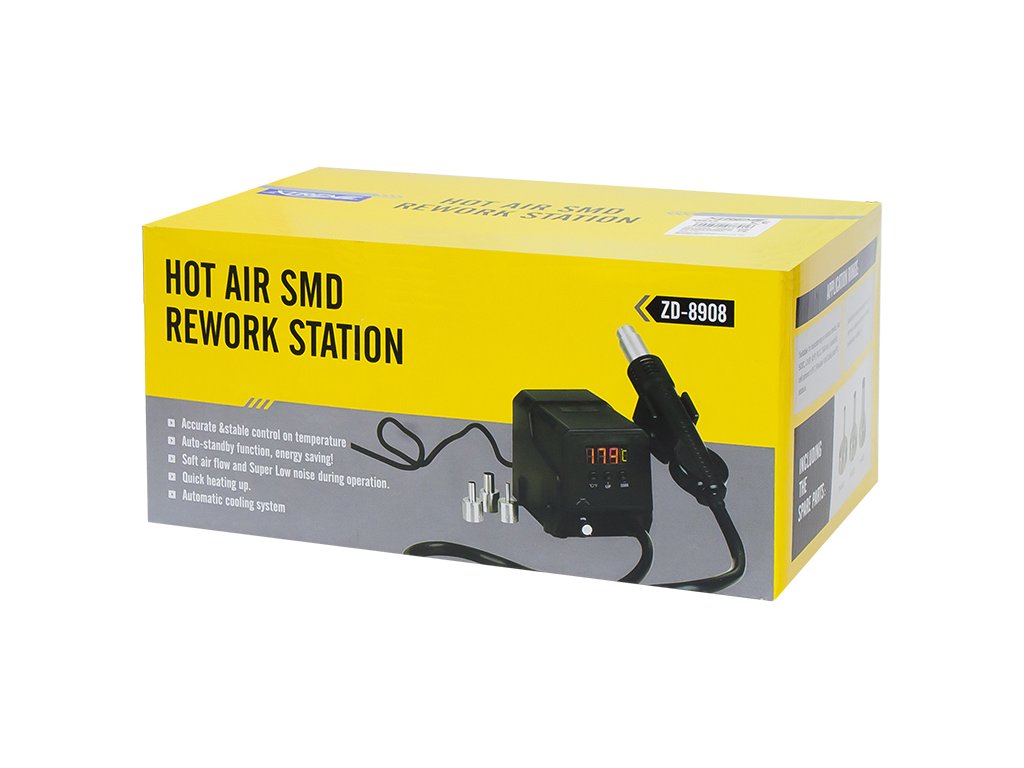 - Ručka toplinskog puhala opremljena je senzorom. Kada se ručka podigne, jedinica se odmah prebacuje u radni režim, a kada se ručka vrati u stanicu, prelazi u pripravno stanje. Ova funkcija automatskog pripravnog stanja može uvelike uštedjeti energiju.