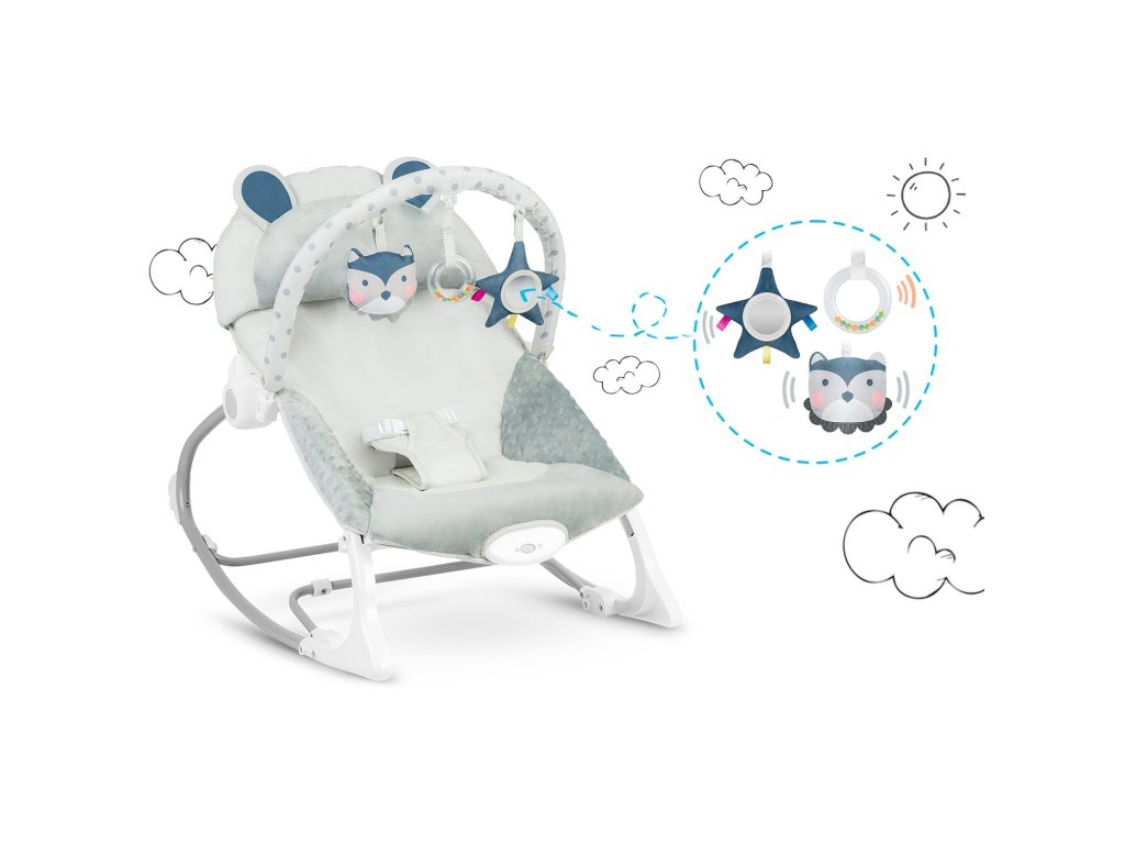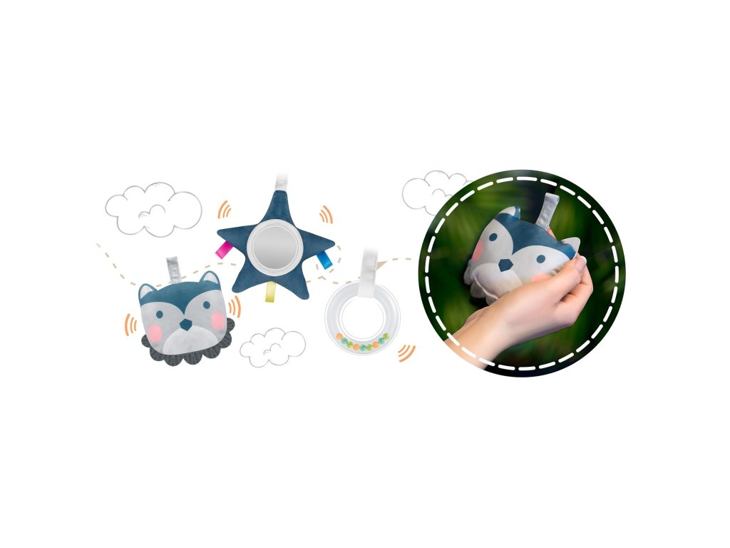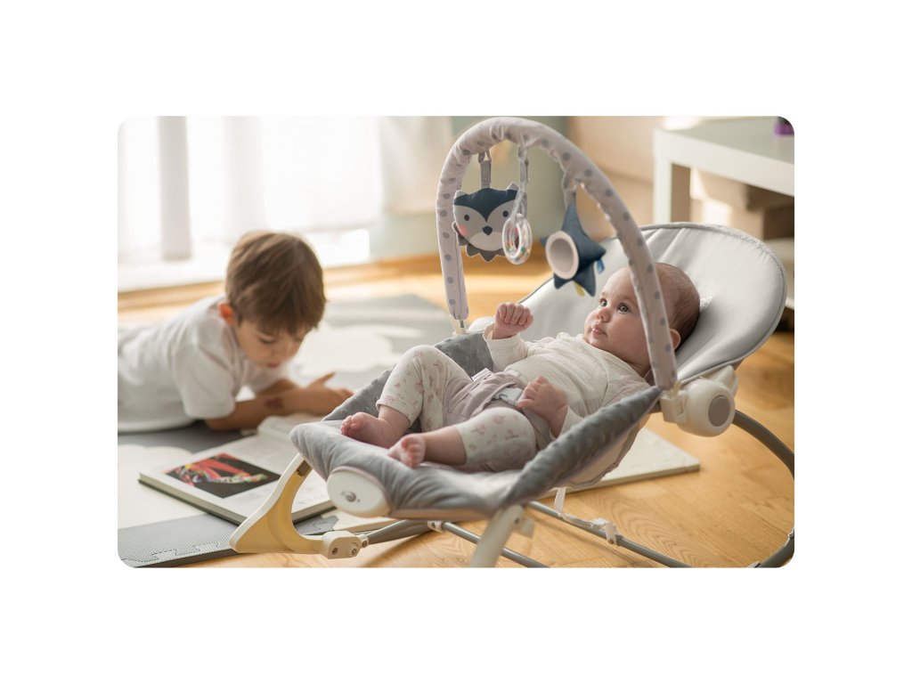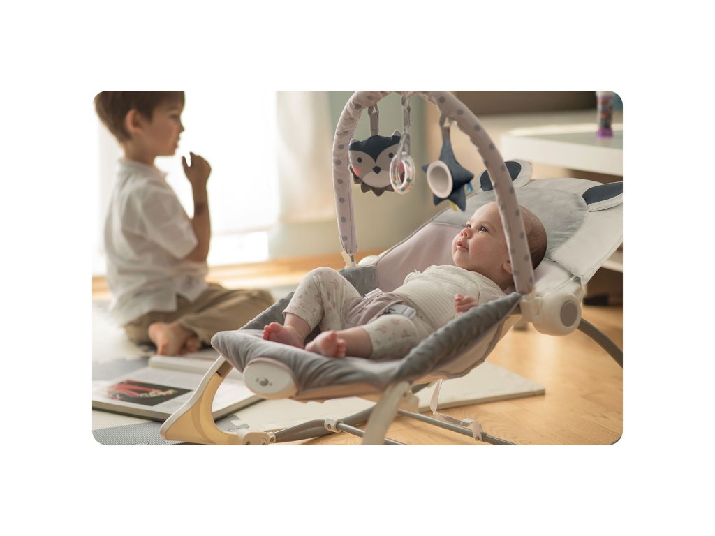 Vrijeme za igru!Ležaljka je opremljena odstranjivom čelenkom s priloženim šuštećim igračkama - sovom i vukom te zvečkom. One će zabaviti vaše dijete dok se vi opuštate. Ove jedinstveneigračke stimuliraju vid i razvijaju hvat.