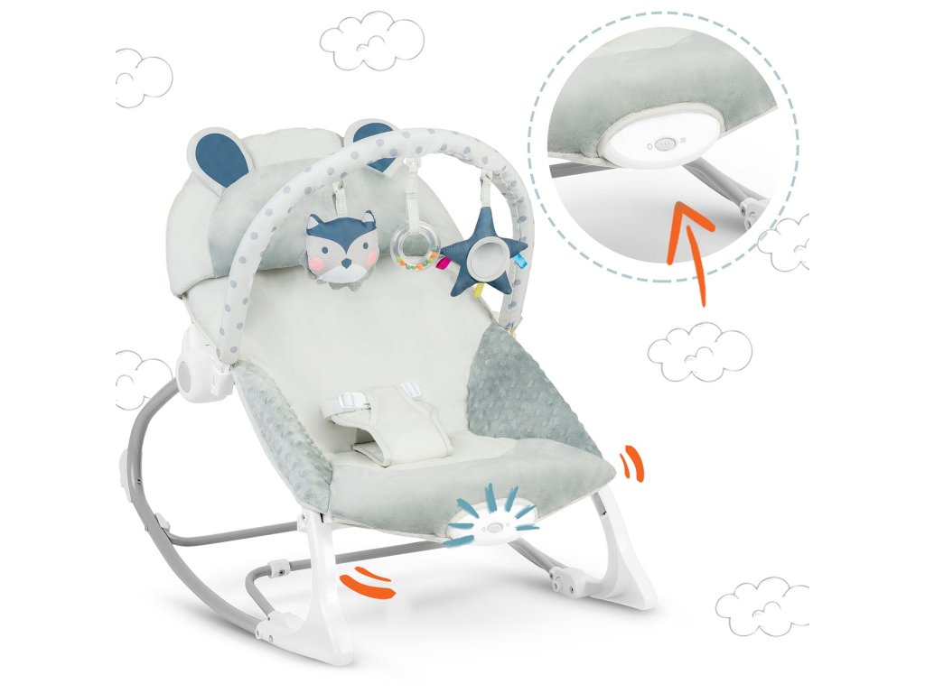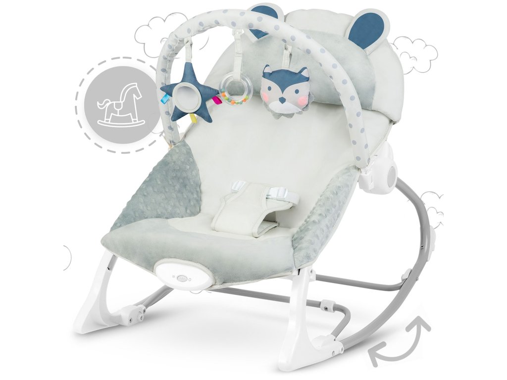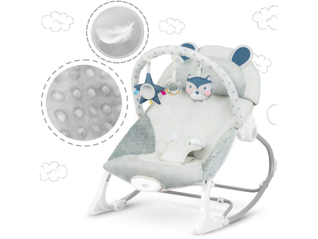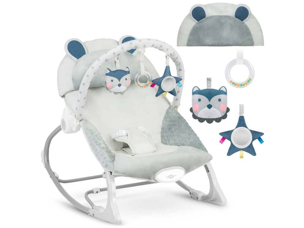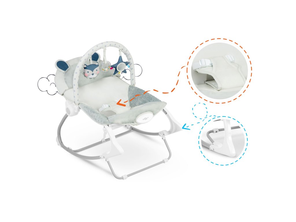 Vrijeme za igru!Ležaljka je opremljena odstranjivom čelenkom s priloženim šuštećim igračkama - sovom i vukom te zvečkom. One će zabaviti vaše dijete dok se vi opuštate. Ove jedinstveneigračke stimuliraju vid i razvijaju hvat.