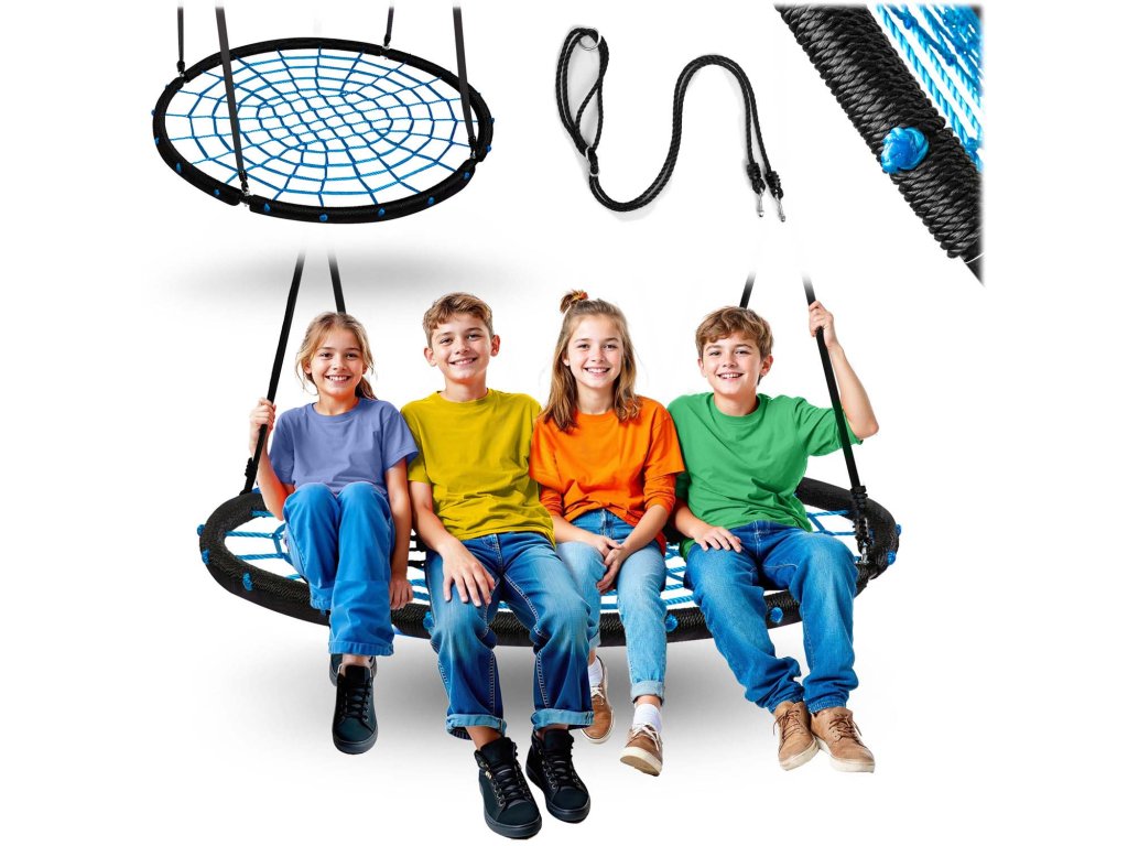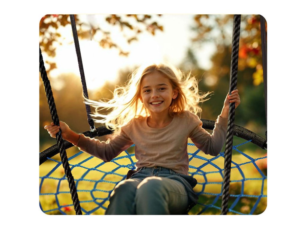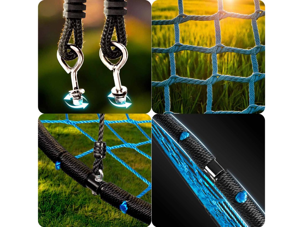 Ljuljačka na čeličnom okviru prekrivena zaštitnim omotačem, od jakog užeta s pletenjem paukove mreže i debelim obješenim užetima. Osigurava sigurnost, stabilnost i trajnost.