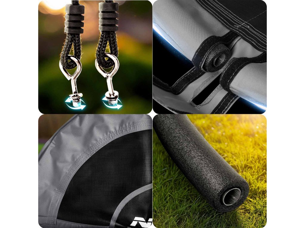 Ljuljačka na čeličnom okviru prekriven mekom zaštitnom PE pjenom s višestrukim šavovima i debelim visećim užadima. Pruža sigurnost, stabilnost i trajnost.