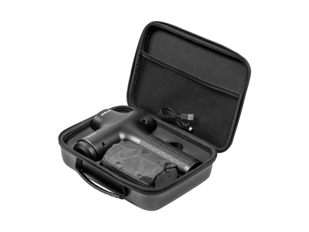 Rebel masažer dolazi s tvrdim kovčegom koji omogućuje praktično skladištenje i transport uređaja. Na taj način možete imati masažer uvijek uz sebe - kod kuće, na poslu ili u teretani.