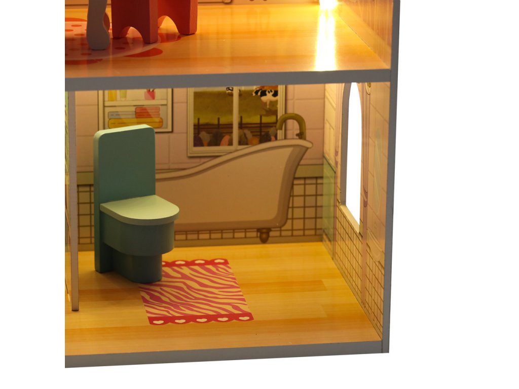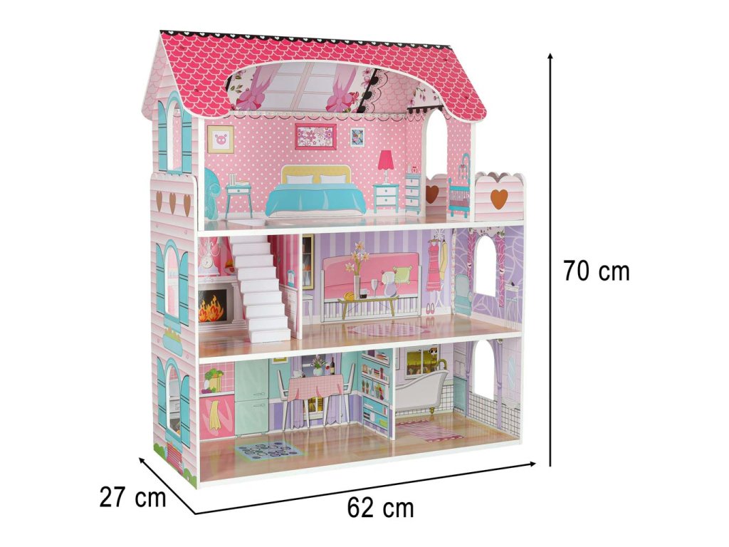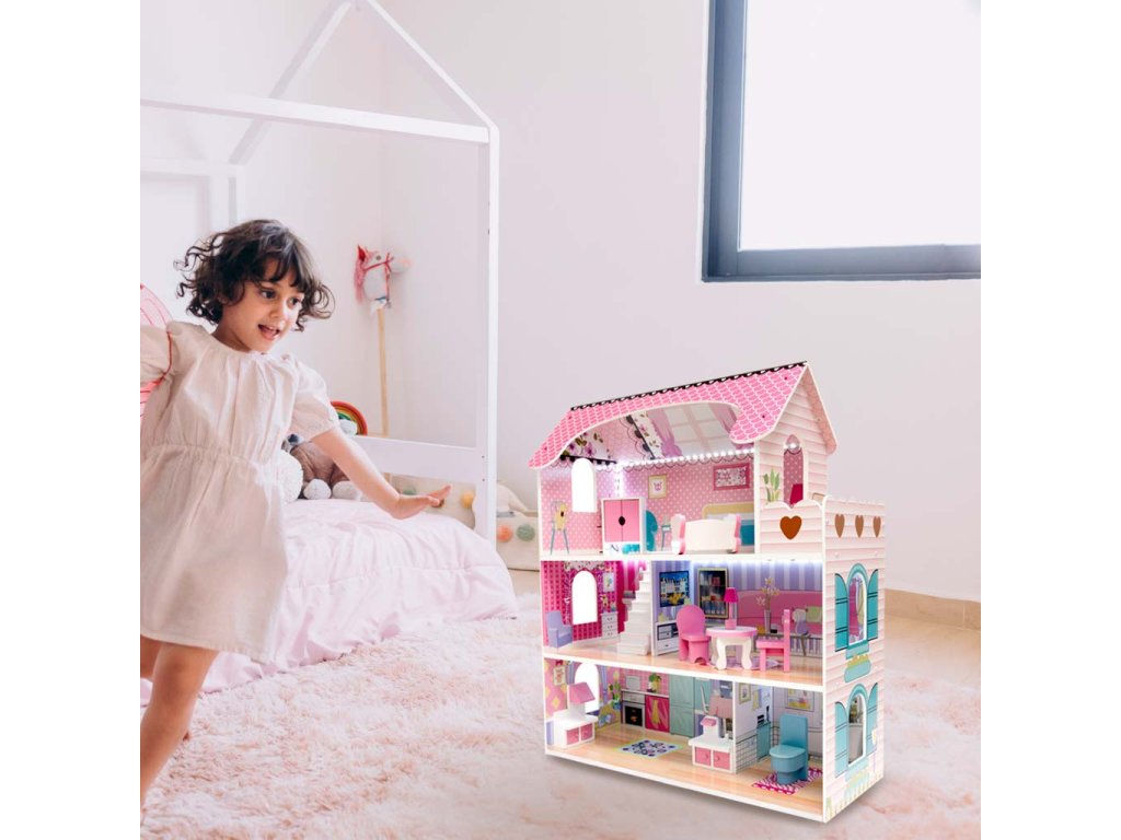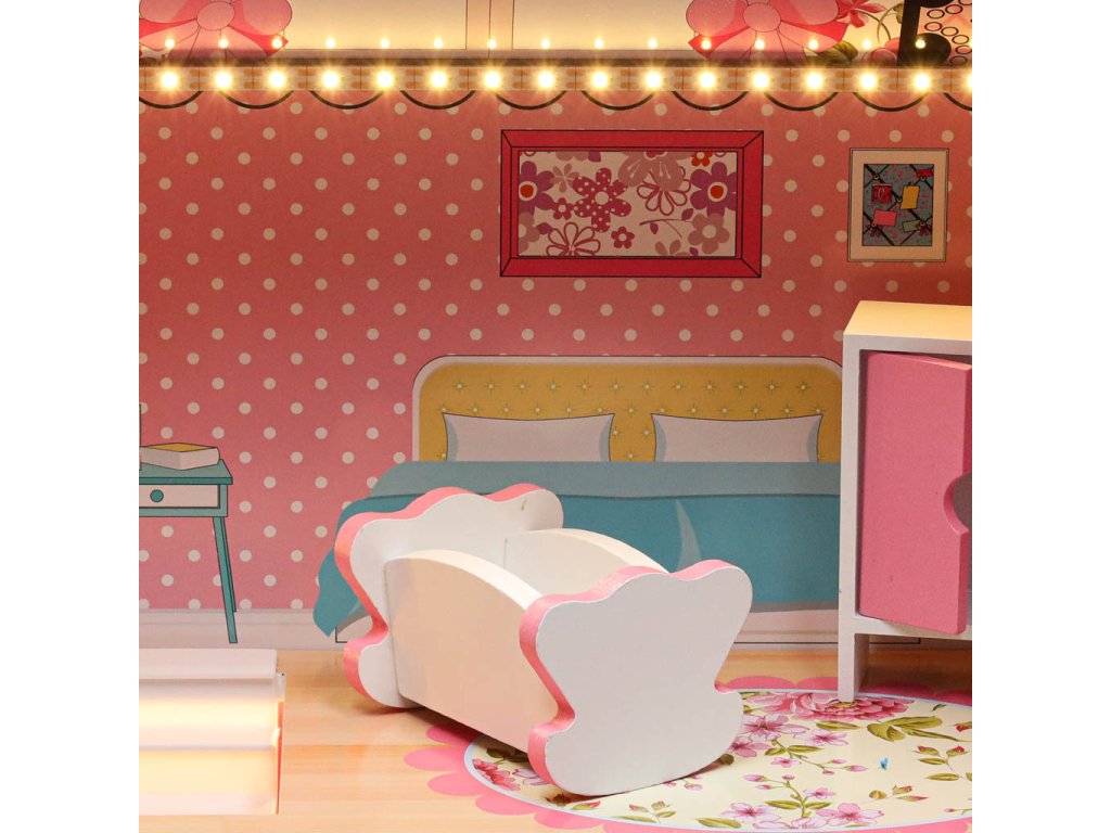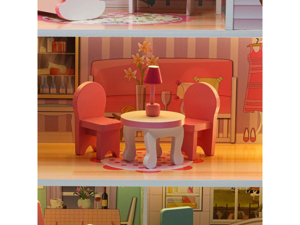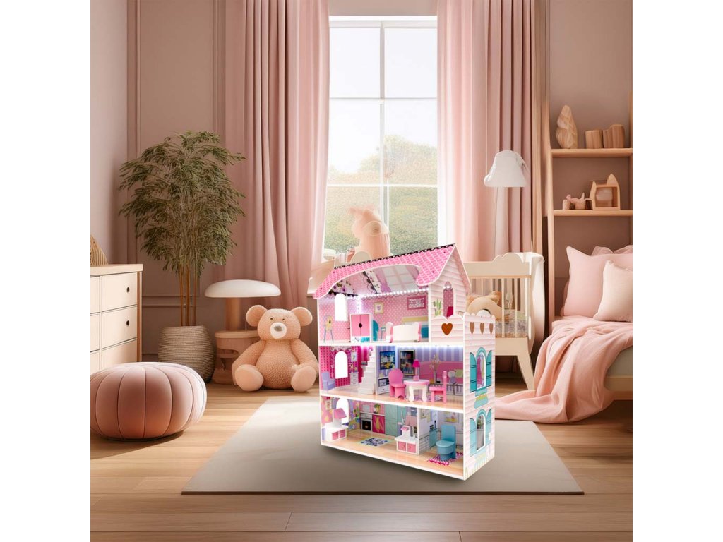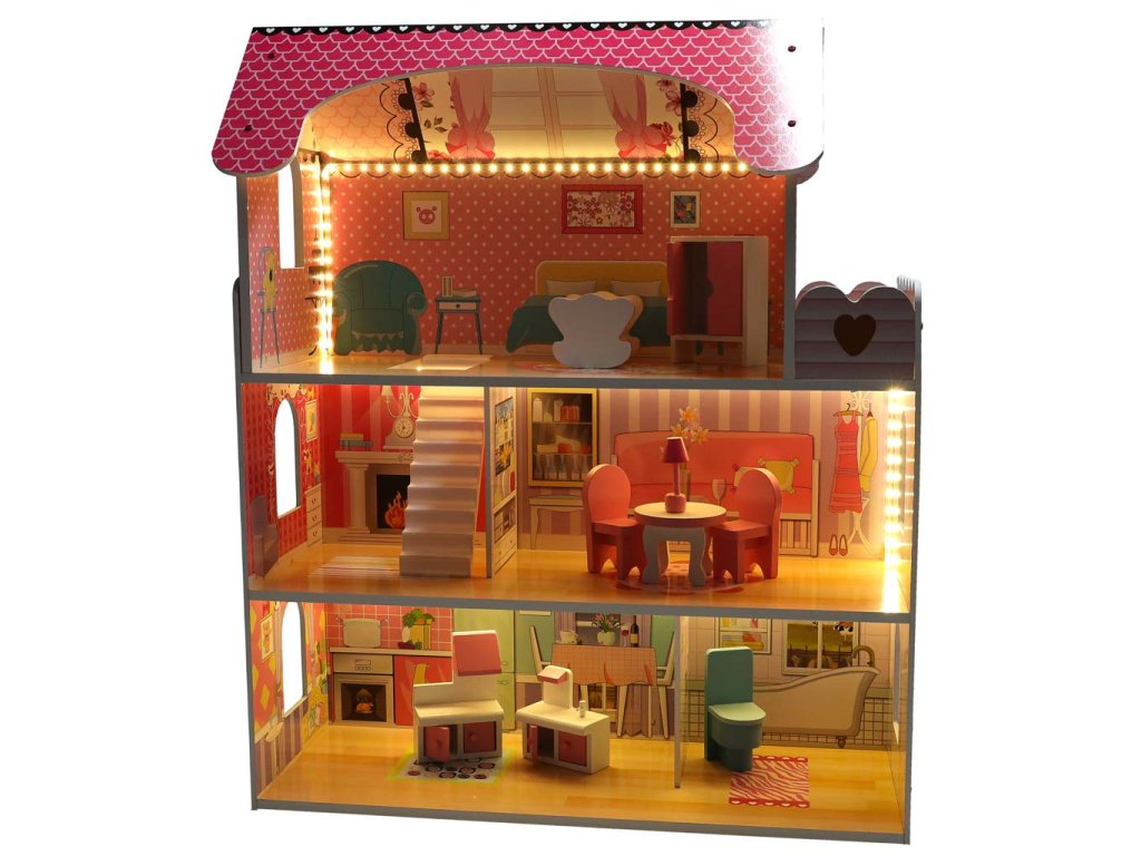 MDF drvena kućica za lutke + namještaj 70cm ružičasta LED
