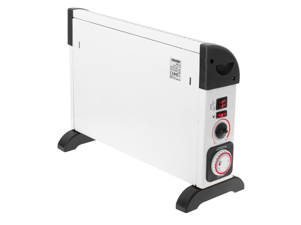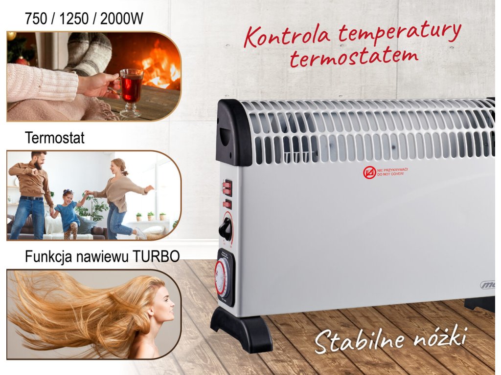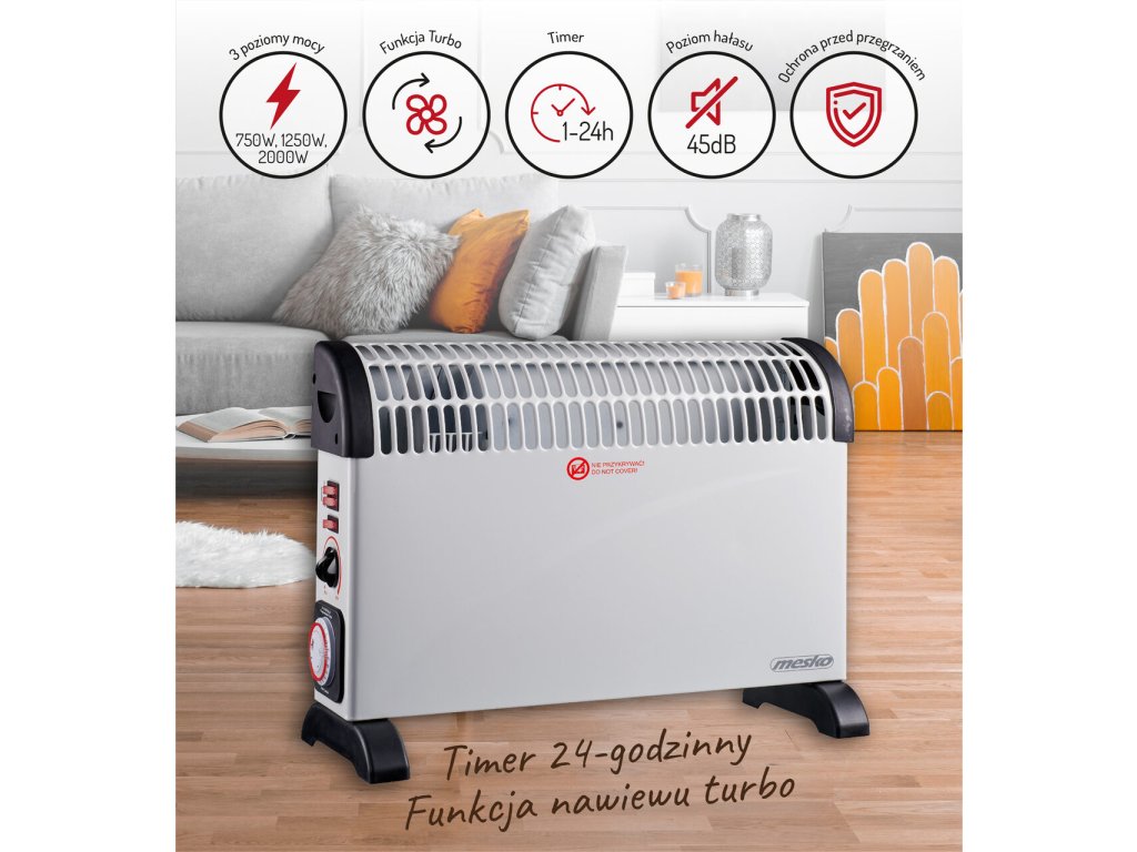 Elektrické konvektorové vykurovacie teleso s časovačom je prenosnou alternatívou bežného radiátora s tým rozdielom, že ho môžete umiestniť presne tam, kde chcete. Teplý vzduch vychádzajúci z ohrievača účinne zvyšuje teplotu okolia, čo je užitočné v rôznych situáciách: keď v miestnosti nie je žiadny iný zdroj tepla a keď zdroje tepla nie sú pre osobu, ktorá sa tam zdržiava, dostatočné. Konvektorový ohrievač je vhodný do domácnosti aj do kancelárie. Prídavná funkcia TURBO ventilátora zabezpečuje rýchlu distribúciu vzduchu. Ohrievač je vybavený 3 úrovňami výkonu: 750 W, 1250 W, 2000 W.