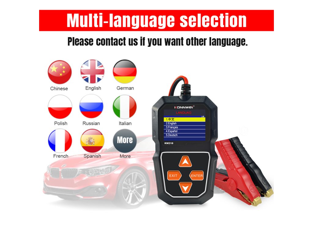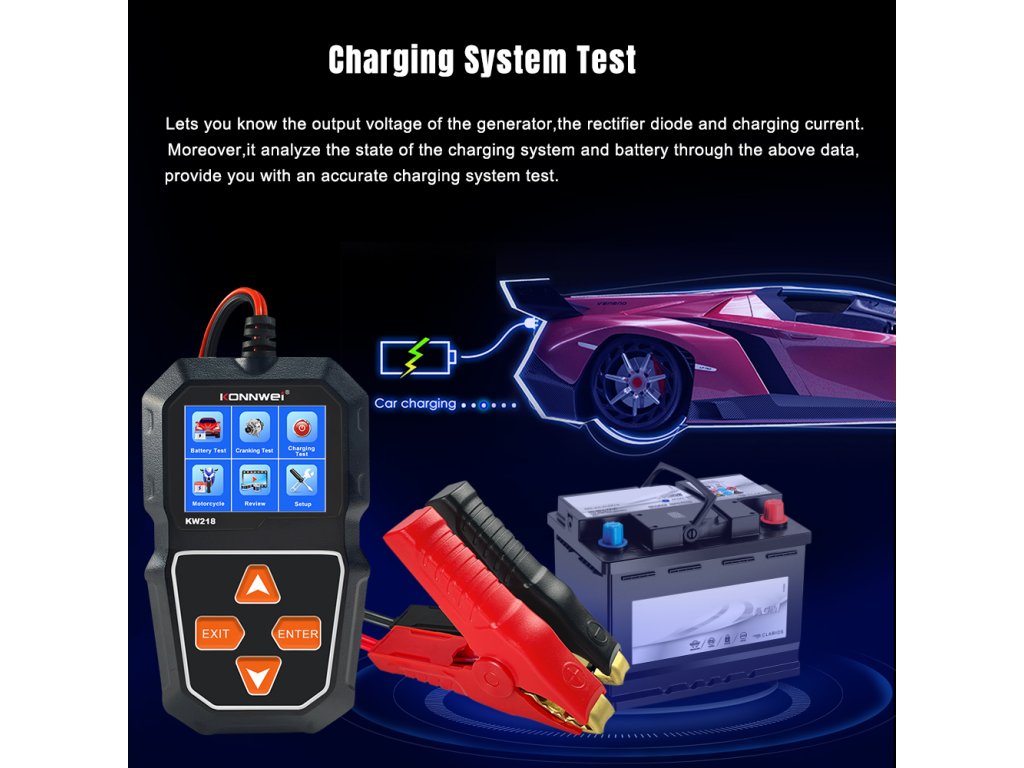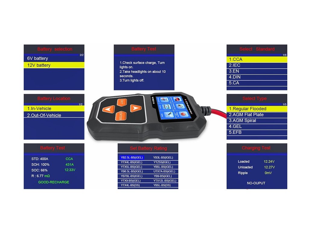 Mjerač baterija Konnwei KW218 je praktičan i pouzdan alat za provjeru stanja baterije u rasponu napona od 6 do 12 V. Omogućuje očitavanje ključnih parametara, kao što su SOC (razina napunjenosti), SOH (stanje zdravlja) i unutarnji otpor, što omogućuje brzo i točno procjenjivanje stanja baterije. Raspon mjerenja je od 100 do 2000 CCA, a svi podaci su prikazani na jasnom LCD zaslonu.