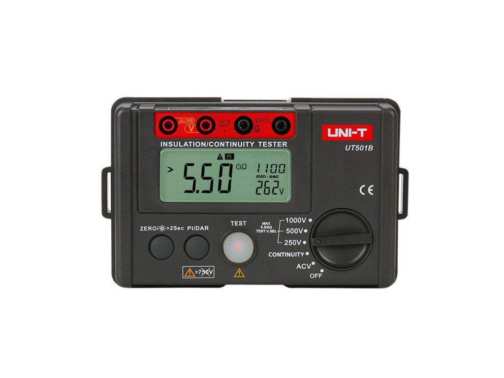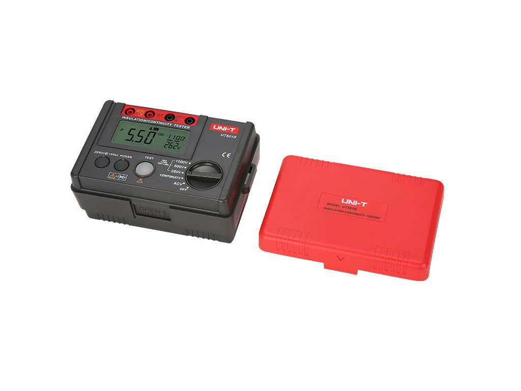 Mjerač otpornosti izolacije UNI-T UT501B je digitalni mjerni instrument namijenjen za elektroniku i električare. Omogućuje mjerenje velikih otpornosti do 5 GOhm pri ispitnom naponu od 1000 V. Osim toga, mjerač omogućuje mjerenje izmjeničnog napona i mjerenje malih otpornosti. Ostale funkcije uključuju test dielektrične apsorpcije, indeksiranje polarizacije ili funkciju nuliranja. Ovaj model ispunjava standard IECG1010.