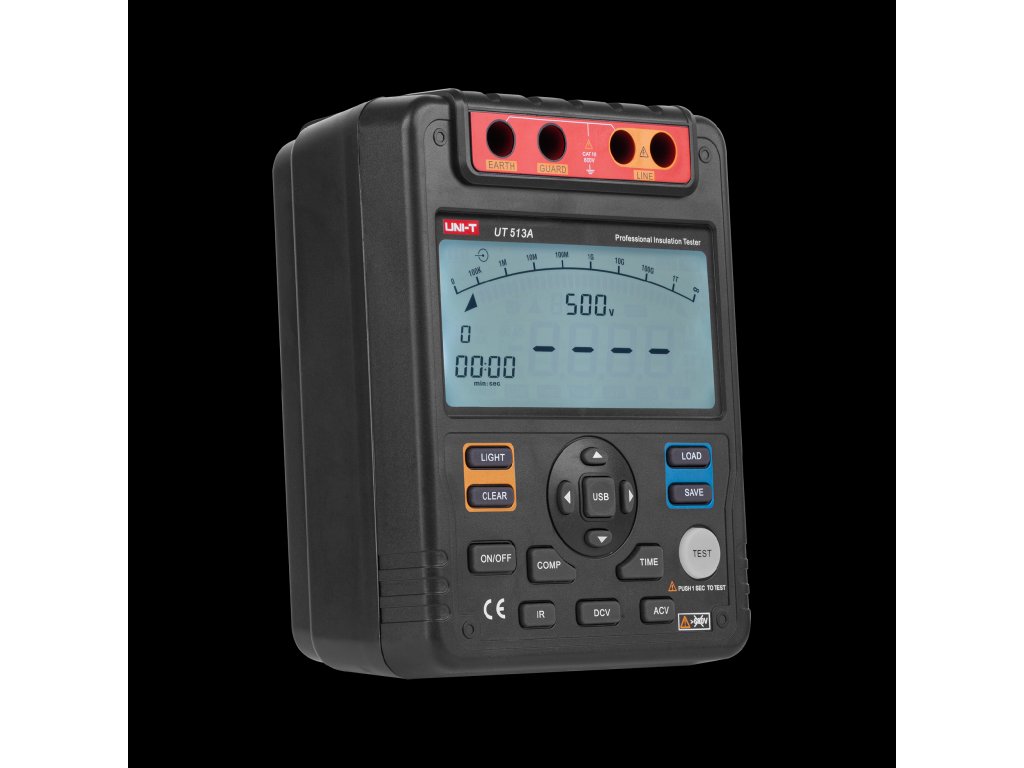 Mjerač izolacijskog otpora UNI-T UT513A digitalni je mjerni uređaj namijenjen za elektroničare i električare. Omogućuje mjerenje velikih otpornosti do 1000 GOhm pri ispitnom naponu od 5000 V. Od brojnih drugih funkcija valja istaknuti test dielektrične apsorpcije, indeks polarizacije ili funkciju usporedbe. Ovaj model zadovoljava standard IECG1010.