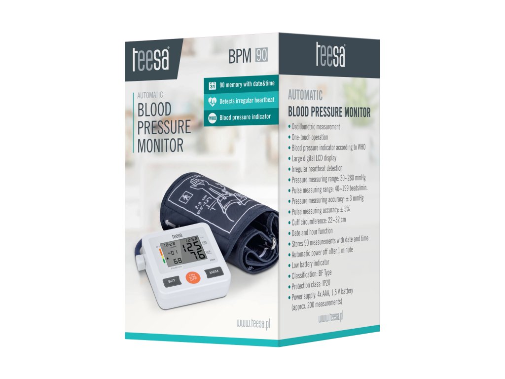 Teesa BPM90 tlakomjer za nadlakticu neophodan je dio vašeg doma. Zahvaljujući jednostavnosti upotrebe i oscilometrijskoj metodi mjerenja tlaka uz pomoć manžete, uređaj vam omogućuje brzo i neovisno praćenje krvnog tlaka. Važno je da vas uređaj zahvaljujući svojoj funkcionalnosti informira o bilo kakvim nepravilnostima vezanim uz srčanu aritmiju.