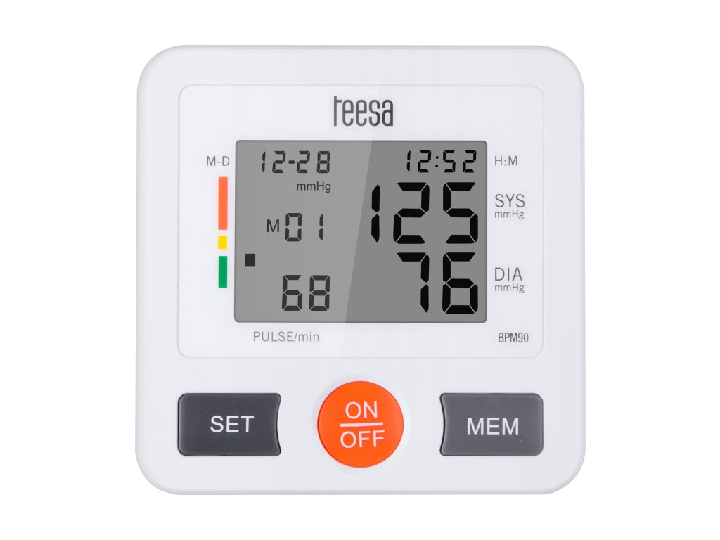 Zahvaljujući svojoj preciznosti, Teesa BPM90 će vam pomoći da se osjećate sigurnije ili na vrijeme poduzmete preventivne mjere! Vaš krvni tlak mjeri se prema standardi WHO. Za bolju kontrolu rezultata memorijska funkcija sprema zadnjih 90 mjerenja. Sve potrebne informacije, tj. mjerenje krvnog tlaka i frekvencije pulsa, kao i datum i vrijeme, jasno se prikazuju na LCD zaslonu.