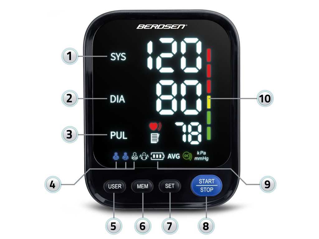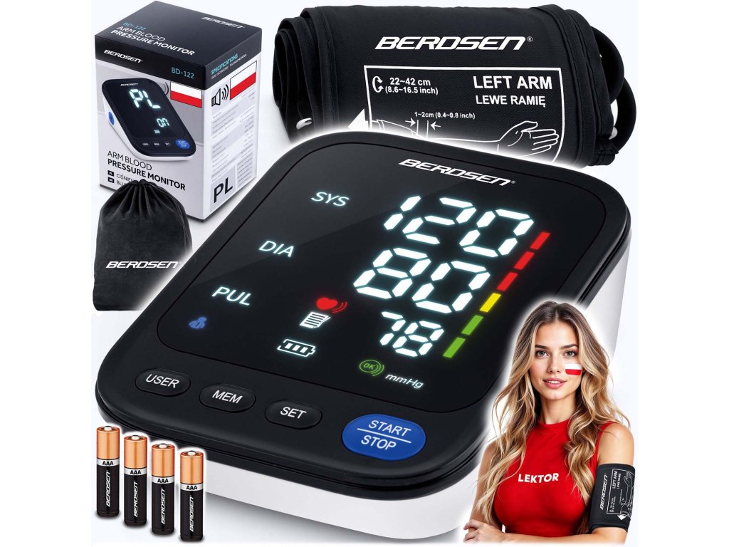 Pouzdani mjerač krvnog tlaka s poljskim porukama ? Moderan i funkcionalan Otkriva nepravilnosti u mjerenju. Obavještava o nepravilnom otkucaju srca. Memorija do 398 mjerenja - 2 korisnika. Čitljiv LED zaslon. ? Jednostavan za korištenje Poljski i engleski govorni (postavke) Torbica u kompletu za jednostavno pohranjivanje. Udoban rukav s prilagodbom — od 22 do 42 cm opsega nadlaktice. Skala mjerenja tlaka za lakšu interpretaciju rezultata. Poljski govorni asistent i jednostavno rukovanje! ? Čitljive glasovne poruke na poljskom – uređaj korak po korak prenosi što raditi, čime se olakšava korištenje čak i starijim osobama ili osobama sa slabijim vidom. ? Bolje razumijevanje rezultata – glasovna očitanja vrijednosti tlaka i pulsa donose udobnost i sigurnost mjerenja. ? Idealno za starije osobe – nema potrebe očitavati brojke s ekrana, što olakšava svakodnevno korištenje mjeračem tlaka. ? Mjerač tlaka BERDSEN™ s čitljivim LED zaslonom i poljskim glasovnim asistentom Za svakodnevna mjerenja za cijelu obitelj. Izuzetno funkcionalan i jednostavan za korištenje. Jednostavno korištenje i brzi rezultati Sistolički krvni tlak. Dijastolički krvni tlak. Puls — rezultat mjerenja pulsa. Korisnici. USER — prebacivanje korisnika. MEMORY — pohranjena mjerenja. SET — postavke. Gumb START/STOP — pokreće ili zaustavlja uređaj i mjerenje. Otkrivanje pravilnog postavljanja manžete. Skala mjerenja. ? Kako pravilno izmjeriti tlak Sjednite udobno, s leđima naslonjenima. Ruke položite na stol ili naslon za ruke. Ne konzumirajte napitke s kofeinom 30 min prije mjerenja. Ne pušite cigarete 30 min prije mjerenja. Mjerenja obavljajte svakodnevno u isto vrijeme. Ponovite svako mjerenje 3 puta i uzmite prosjek tih mjerenja. Između mjerenja pričekajte 1 minutu. Bilježite svakodnevno mjerenja. Kako pravilno očitati parametre tlaka na zaslonu Pravilni tlak se javlja kada se njegove vrijednosti kreću u rasponu od 100–139/60–89 mmHg. Za idealni tlak smatra se tlak od 120/80 mmHg. 1. Sistolički tlak: Najviša je brojka — predstavlja tlak kada se vaše srce stegne pumpajući krv u tijelo. 2. Dijastolički tlak. Najniža je brojka — predstavlja tlak između otkucaja, kada se vaše srce opušta. ? Kompletan set Mjerač tlaka Manžeta za nadlakticu Torba za pohranu 4 AAA baterije Upute za uporabu ? Rasponi mjerenja Sistolički tlak: 57 mmHg - 255 mmHg Dijastolički tlak: 25 mmHg - 195 mmHg Puls: 40 - 199 otkucaja u minuti ? MJERAČ TLAKA BERDSEN JE MEDICINSKI PROIZVOD Specifikacije: metoda mjerenja: oscilometrijska metoda mjerenja, raspon mjerenja: 0-295 mmHg, težina: 0,26 kg, memorija — do 398 zapisa s datumom i vremenom, napajanje: 4 AAA baterije uključene u komplet, mogućnost napajanja medicinskim mrežnim adapterom (DC 5,0 V; 1000 mA) - nije uključen u komplet, indikator klasifikacije tlaka, veličina manžete: 22 - 42 cm, automatsko isključivanje, zvučni signali, otkrivanje niske razine baterije. Vaše srce kuca za voljene. Kućna okolina je idealno mjesto za redovito mjerenje tlaka. Upravo kod kuće smo najopušteniji, što izravno utječe na rezultate koje najpreciznije provjeravamo BERDSEN™ mjeračima tlaka.Additional parameters