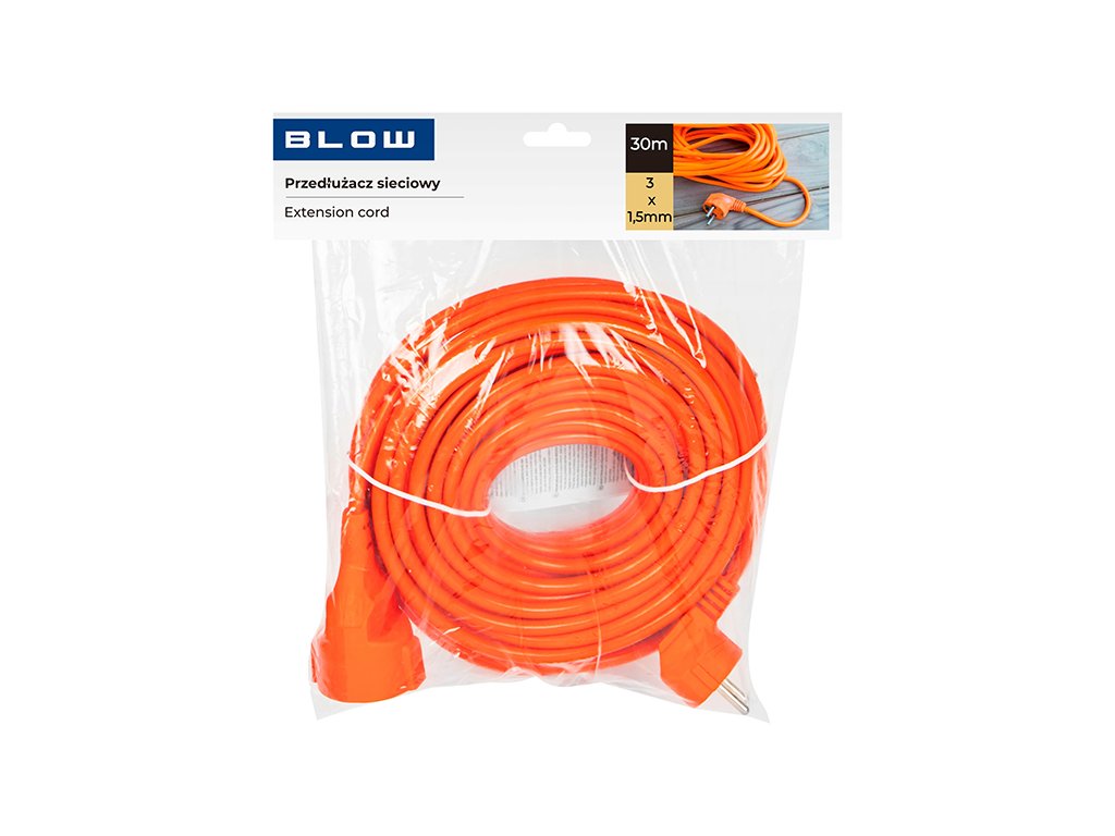 Mrežni produživač BLOW u narančastoj boji s jednim utikačem namijenjen za kućnu upotrebu. Kabel s jedne strane ima utičnicu s uzemljenjem, a s druge strane mrežni priključak. Zahvaljujući njemu možemo povezati električne uređaje koji su udaljeni do 30m od utičnice.