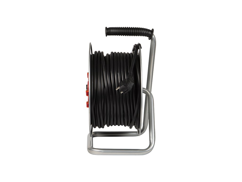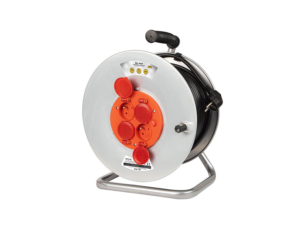 Čvrsti produžni kabel s metalnim bubnjem marke BLOW. Izuzetno koristan i nezamjenjiv kada želimo priključiti električne uređaje, npr. kosilicu, bušilicu, auto usisavač ili vrtno svjetlo. Opremljen je s četiri mrežne utičnice s uzemljenim pinovima i sa samozatvarajućim poklopcima, što mu osigurava klasu otpornosti IP44, što znači da ga bez problema možemo koristiti vani i u lošijim vremenskim uvjetima.