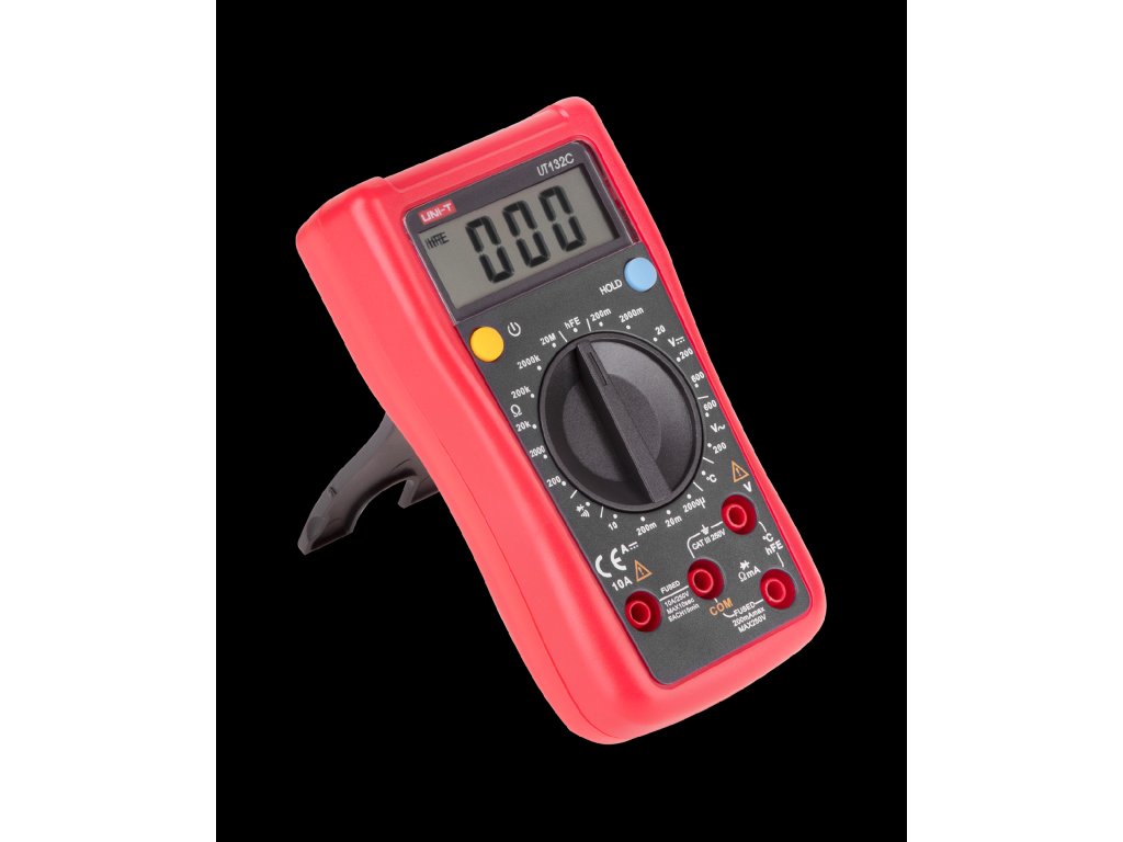 Miernik Uni-T UT132C to jedno z uniwersalnych urządzeń pomiarowych, które umożliwia mierzenie podstawowych wielkości elektrycznych, tj. napięcia stałego lub zmiennego, prądu stałego, a także rezystancji. Ponadto, model pozwala na pomiar temperatury, sprawdzenie ciągłości obwodu, test diod oraz badanie hFE tranzystorów.