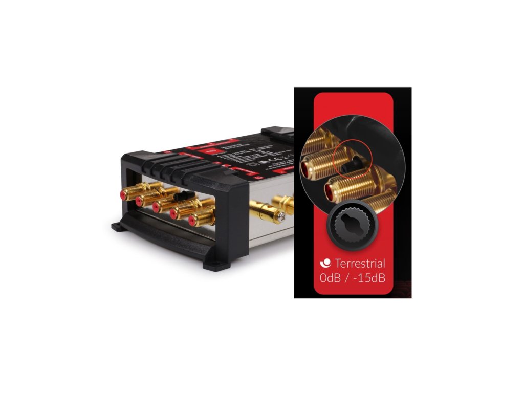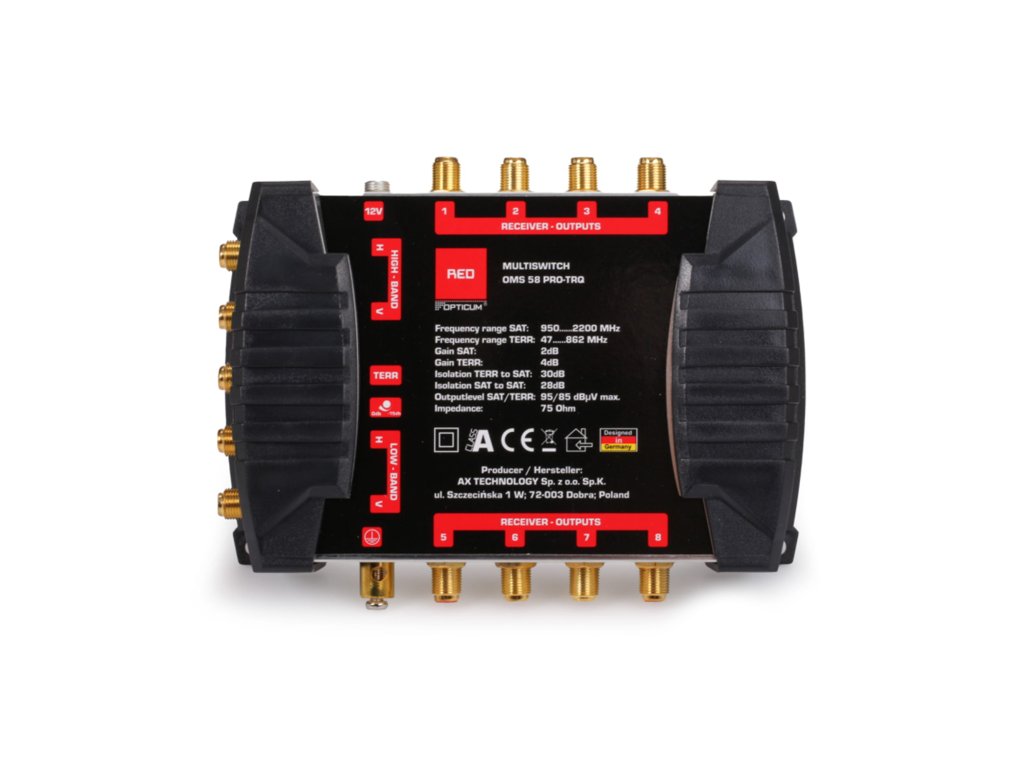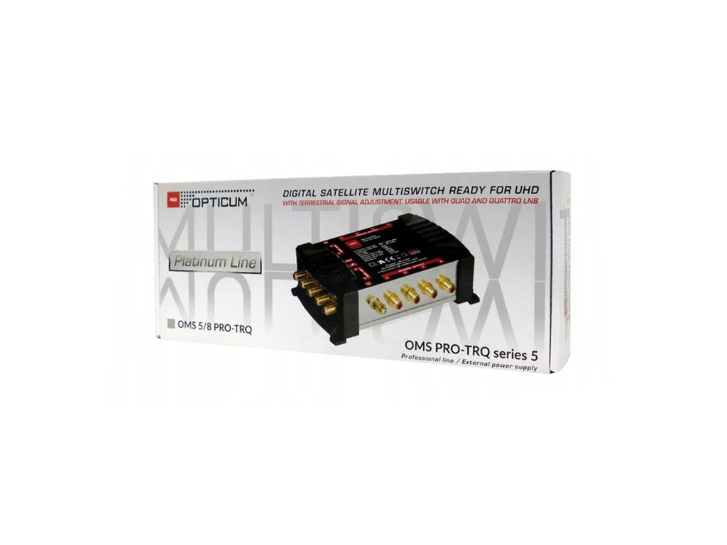 Multiswitch OPTICUM OMS 5/8 PRO TRQ PLATINIUMMultiswitch je namijenjen instalaciji antennih sustava za satelitsku televiziju DVB-S2 i zemaljsku televiziju DVB-T2. Pozlaćeni konektori znatno smanjuju gubitak signala pri spajanju antenskih kabela i sprječavaju pojavu oksidacije. Multipreklopnik automatski prepoznaje vrstu signala koji treba prenijeti u prijemnike. Prilikom instalacije potrebno je uzeti u obzir priključak multipreklopnika na satelitsku antenu promjera najmanje 0,8 m i LNB Quattro ili Quad, kao i na zemaljsku televizijsku antenu. Odvajanje satelitskih i zemaljskih signala koji izlaze iz multipreklopnika provodi se pomoću korisničkih utičnica. Napajanje multipreklopnika provodi se putem vanjskog izvora, čime se eliminira pojava povećane radne temperature, što je čest uzrok oštećenja uređaja.