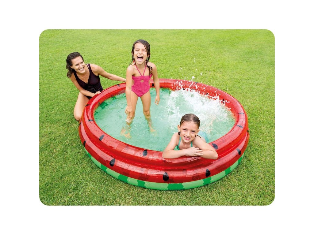 Šareni nafukivalni bazen Intex - klasični je napuhani bazen izrađen od čvrstog vinilnog materijala, čiji su zidovi izrađeni od tri napuhana kruga stilizirana tako da podsjećaju na vodenu lubenicu.