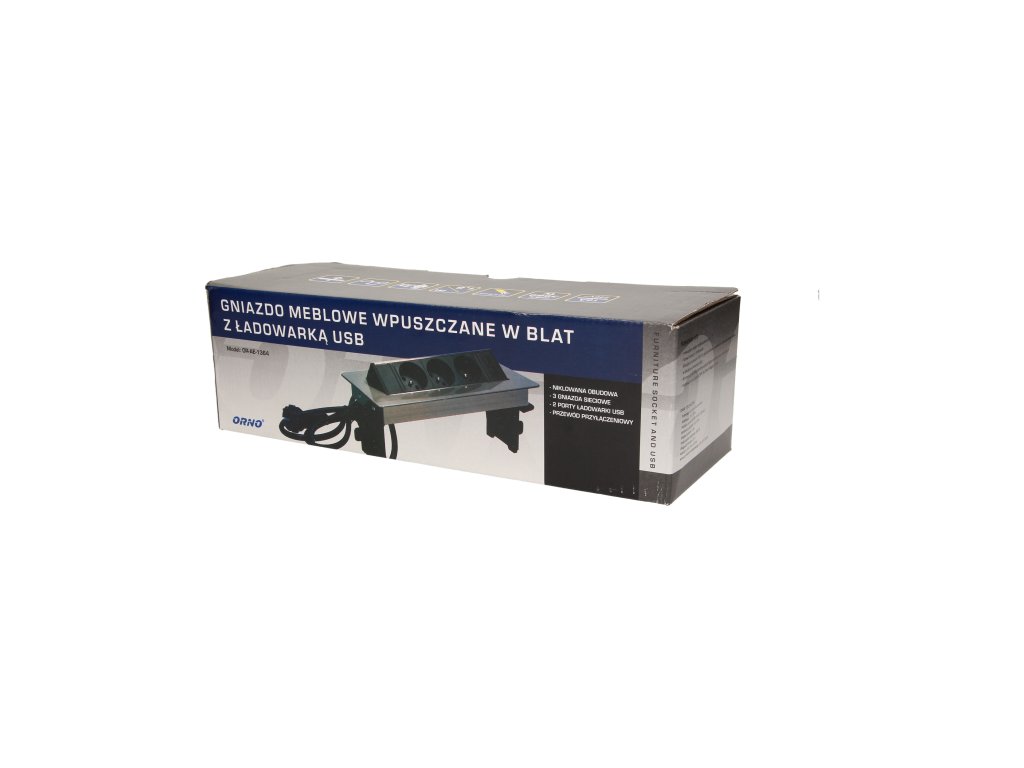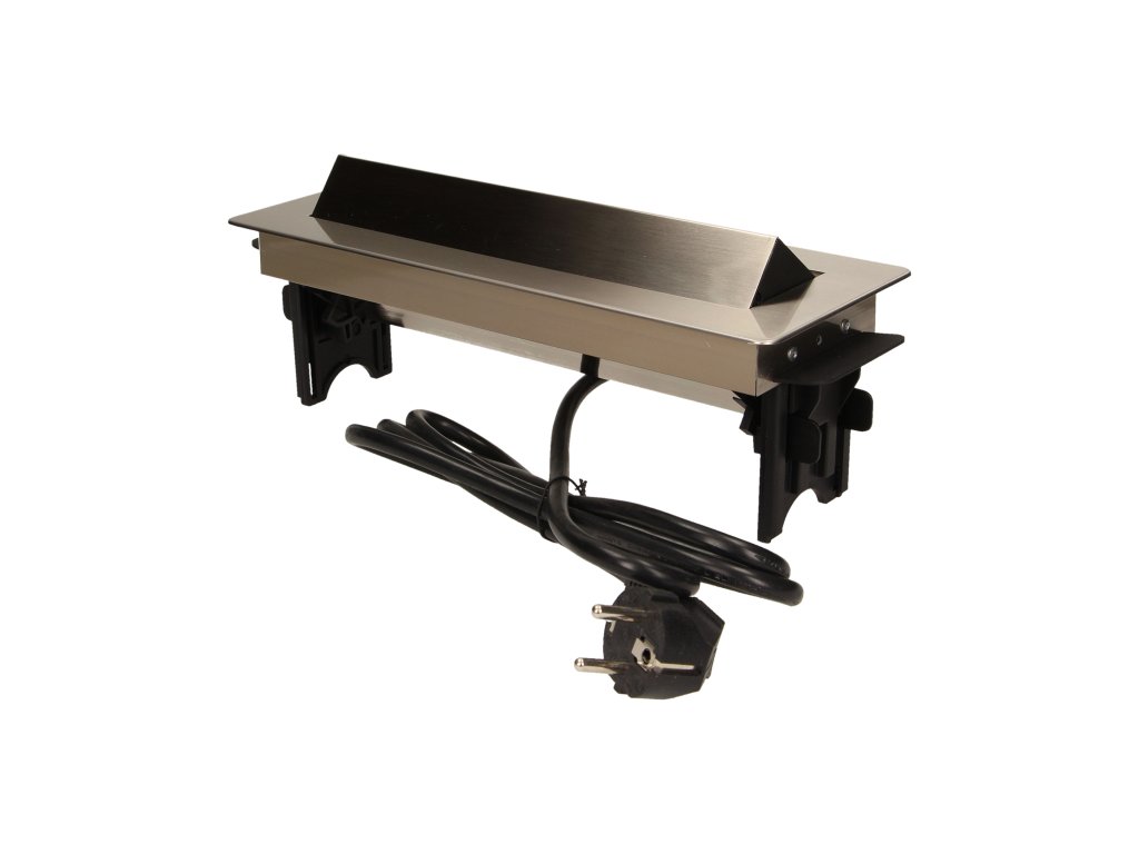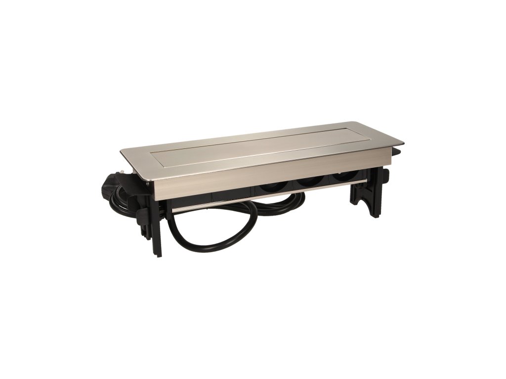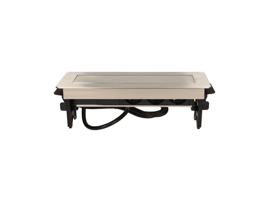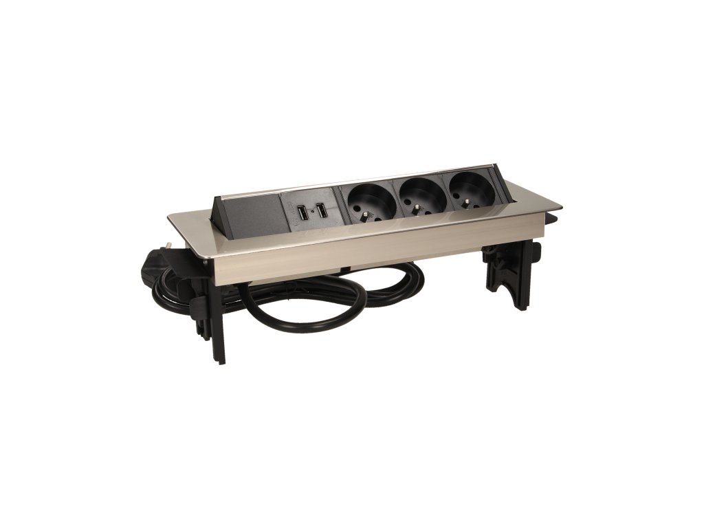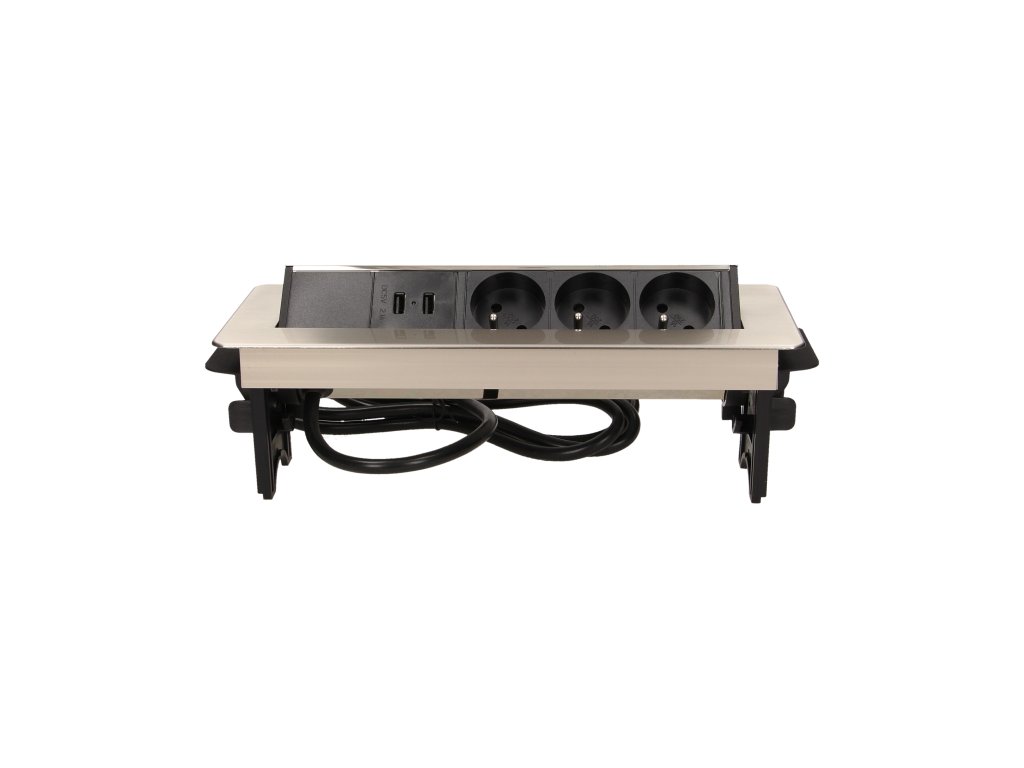 Skup tri utičnice 2P+Z s USB punjačem u niklovanom poklopcu s uvlačivim gornjim dijelom. Uređaj je namijenjen za instalaciju u radne stolove, ploče i stolove.