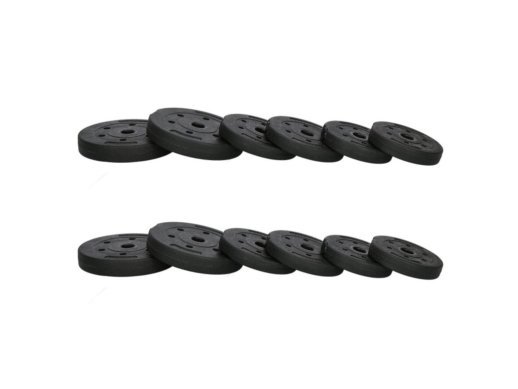 - 4 x záťaž 2,5 kg (priemer: 21,5 cm; hrúbka: 3,5 cm; priemer otvoru: 3 cm)