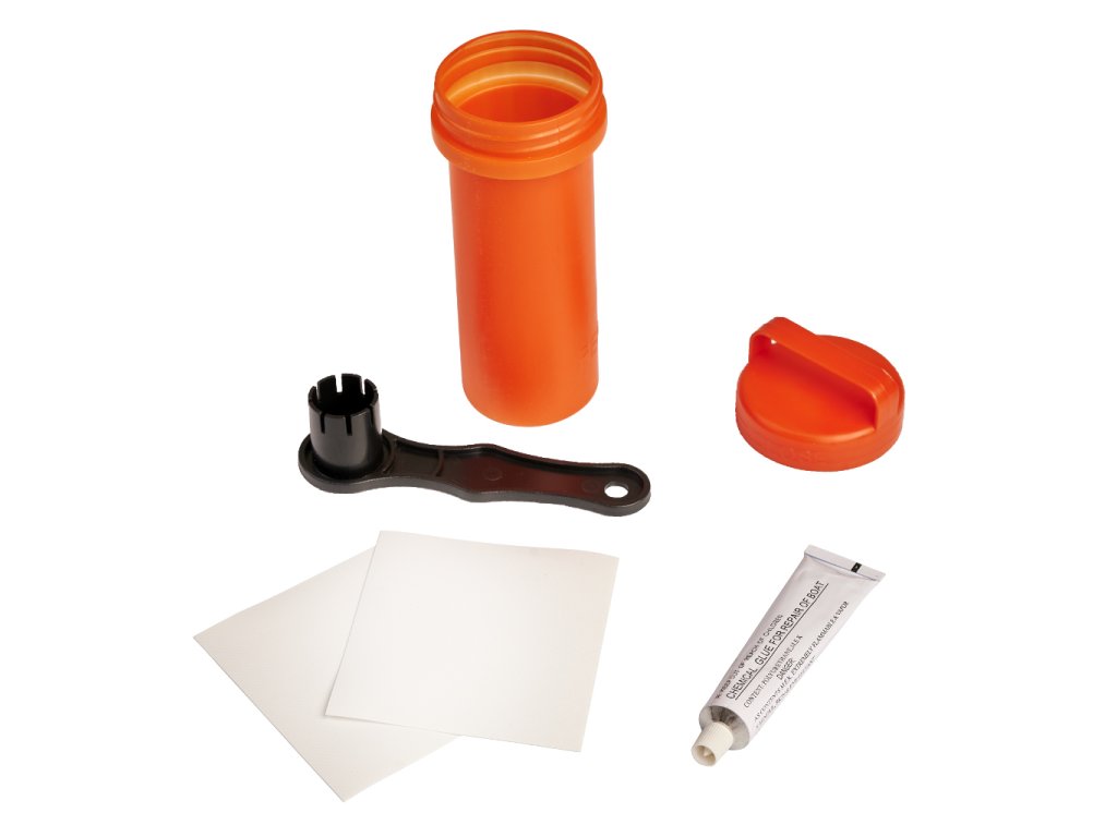 Súprava na opravu s lepidlom, dvoma opravnými záplatami a plastovým kľúčom na ventily, aby ste si mohli sami opraviť drobné poškodenia