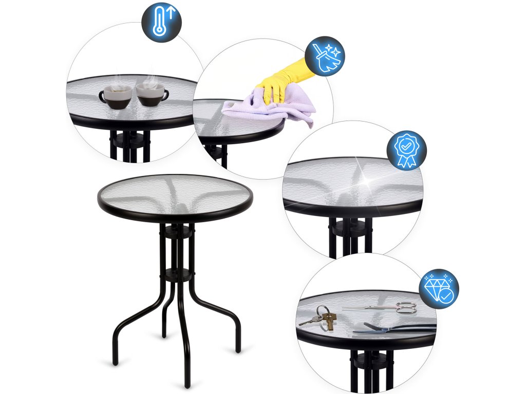 Izdržljivost i otpornost na vremenske uvjete – stolna ploča izrađena od kaljenog stakla, a konstrukcija od nehrđajućeg čelika jamče otpornost na kišu, UV zračenje i promjene temperatura.