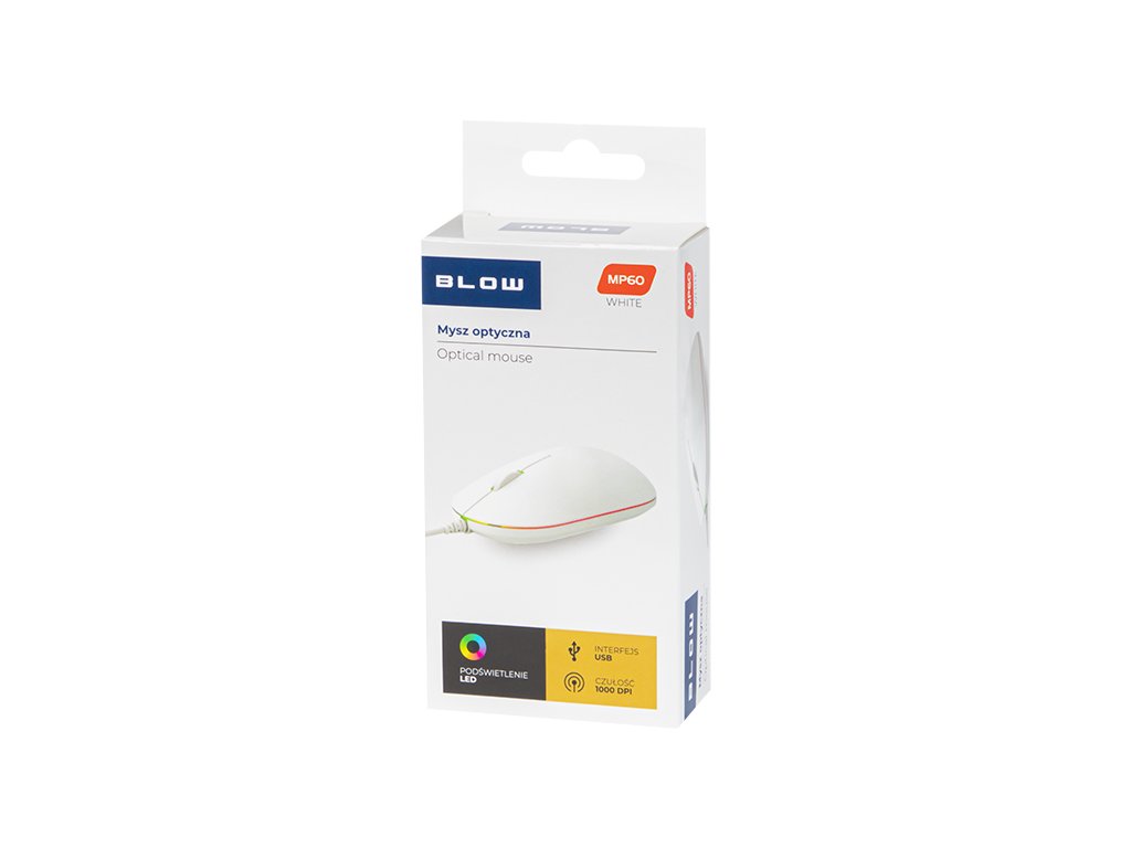 SpecifikacijaModel miša: MP-60Boja: bijelaBroj gumba: 3Vrsta povezivanja: žičnoSučelje: USBOsvjetljenje: LED RGBOptička rezolucija: 1000 DPIDužina kabela: približno 1,5 m Miš BLOW MP-60 s jedinstvenim dizajnom i nježnim LED osvjetljenjem dizajniran je za rad s većinom operativnih sustava. Optička rezolucija od 1000 DPI omogućava učinkovito i precizno rukovanje na gotovo svakoj površini. Optička rezolucija od 1000 DPI omogućava učinkovito i precizno rukovanje na gotovo svakoj površini. Nježno LED osvjetljenje Oko miša i oko kotačića za pomicanje nalazi se tanka linija LED osvjetljenja. Blago svjetlosno osvjetljenje automatski mijenja boje ovisno o korištenju. To ne samo da pridonosi jedinstvenom stilu, već i olakšava korištenje miša tijekom večernjeg ili noćnog rada.Additional parameters