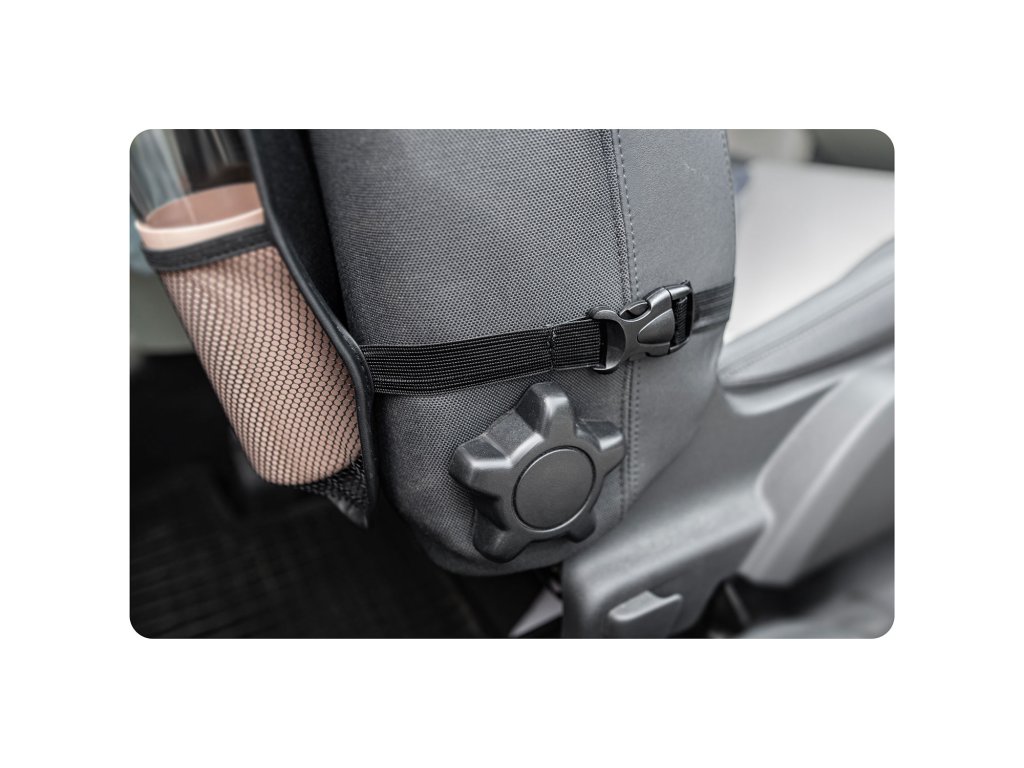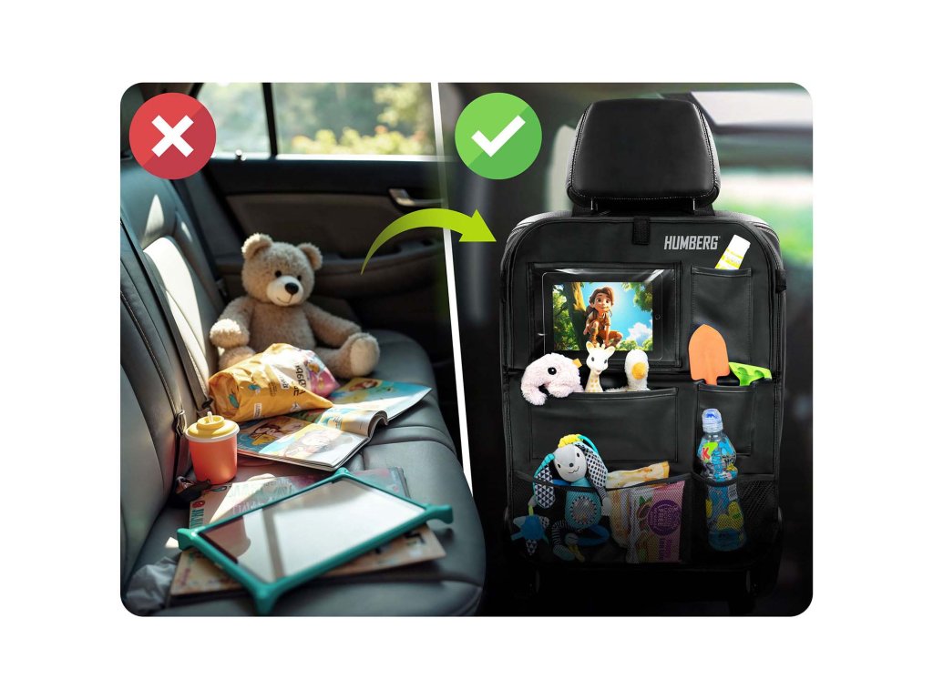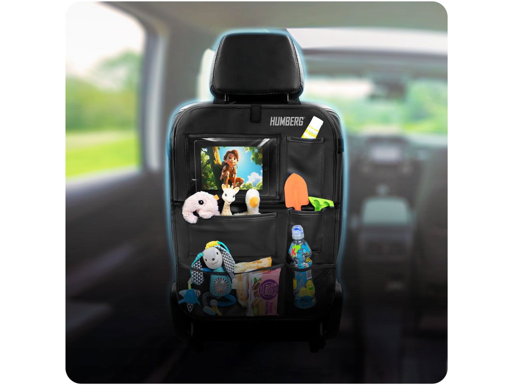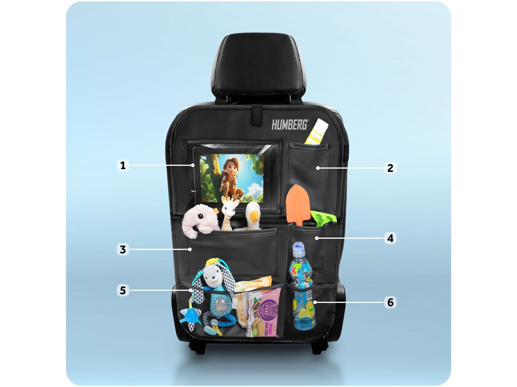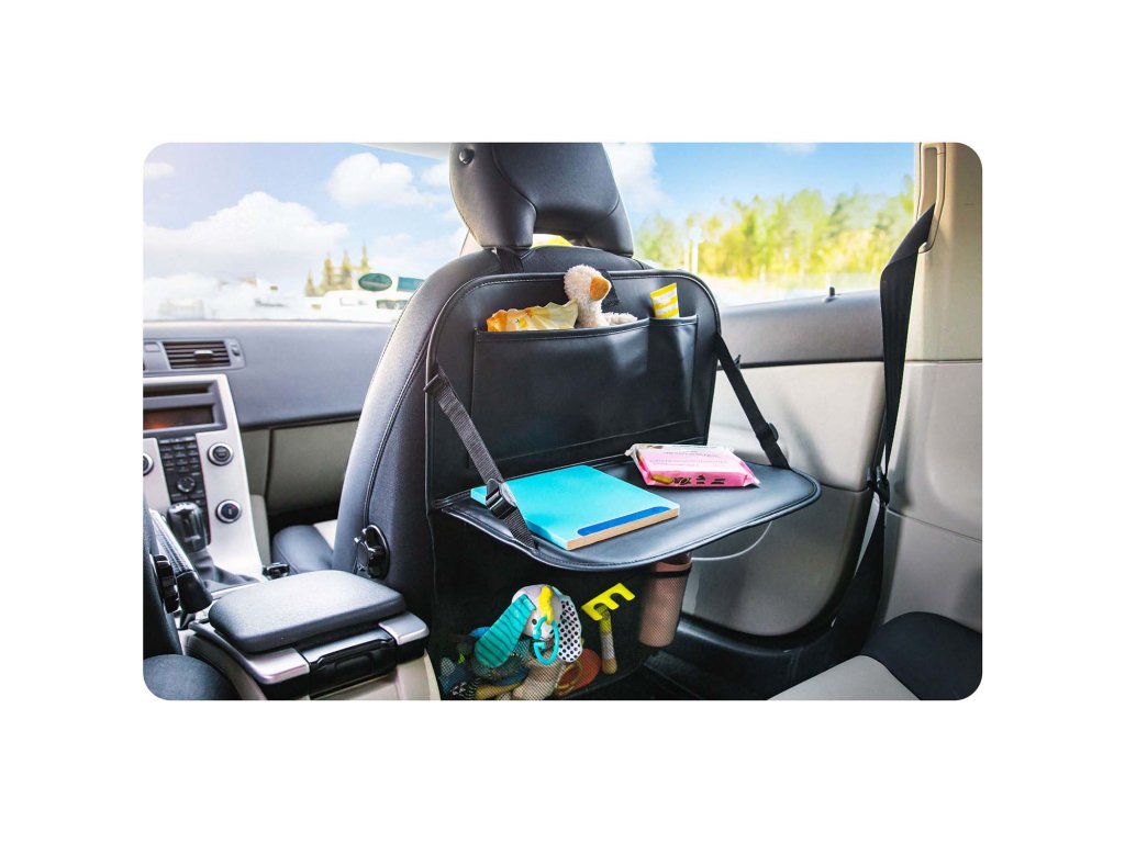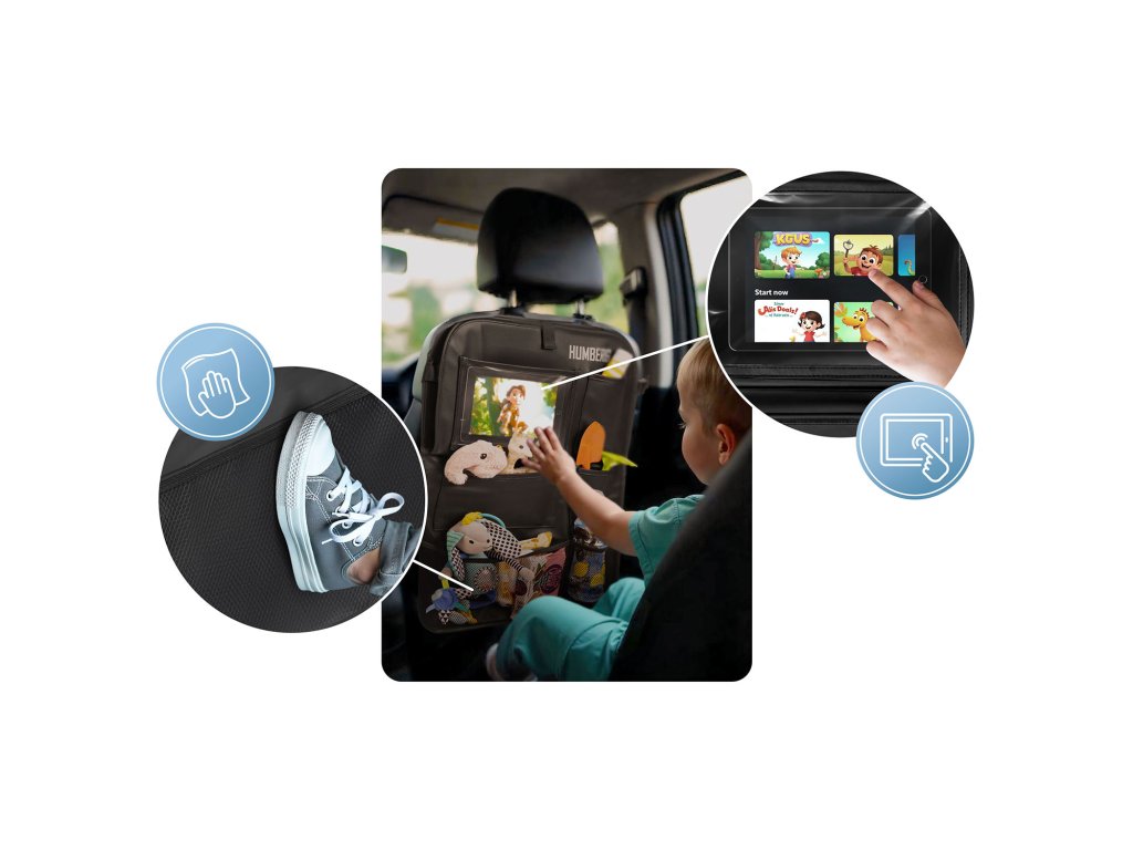 Organizator štiti tapeciranje od prljanja od cipela, a prozirni džep omogućuje djetetu upravljanje tabletom bez vađenja iz futrole. Idealno rješenje za duge vožnje – manje nereda, više mira!